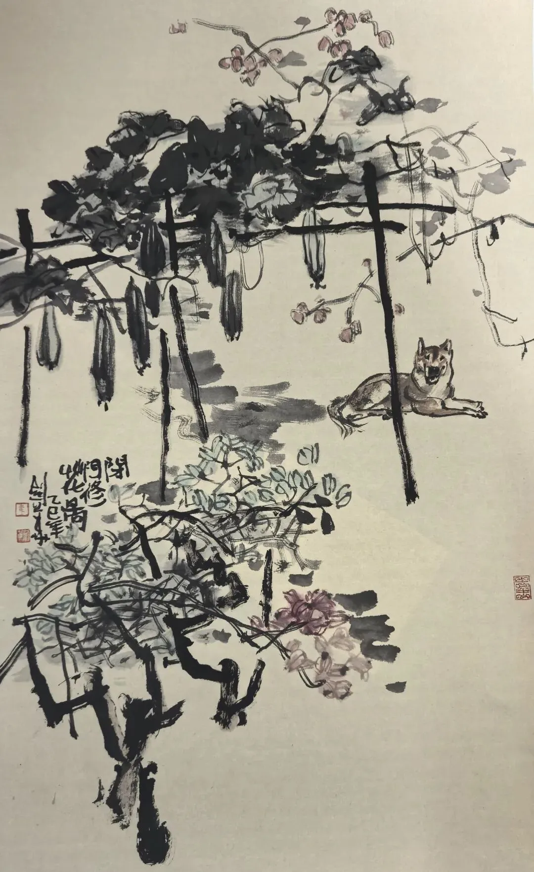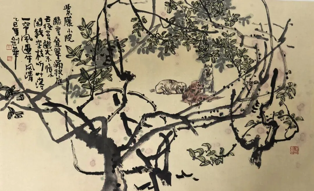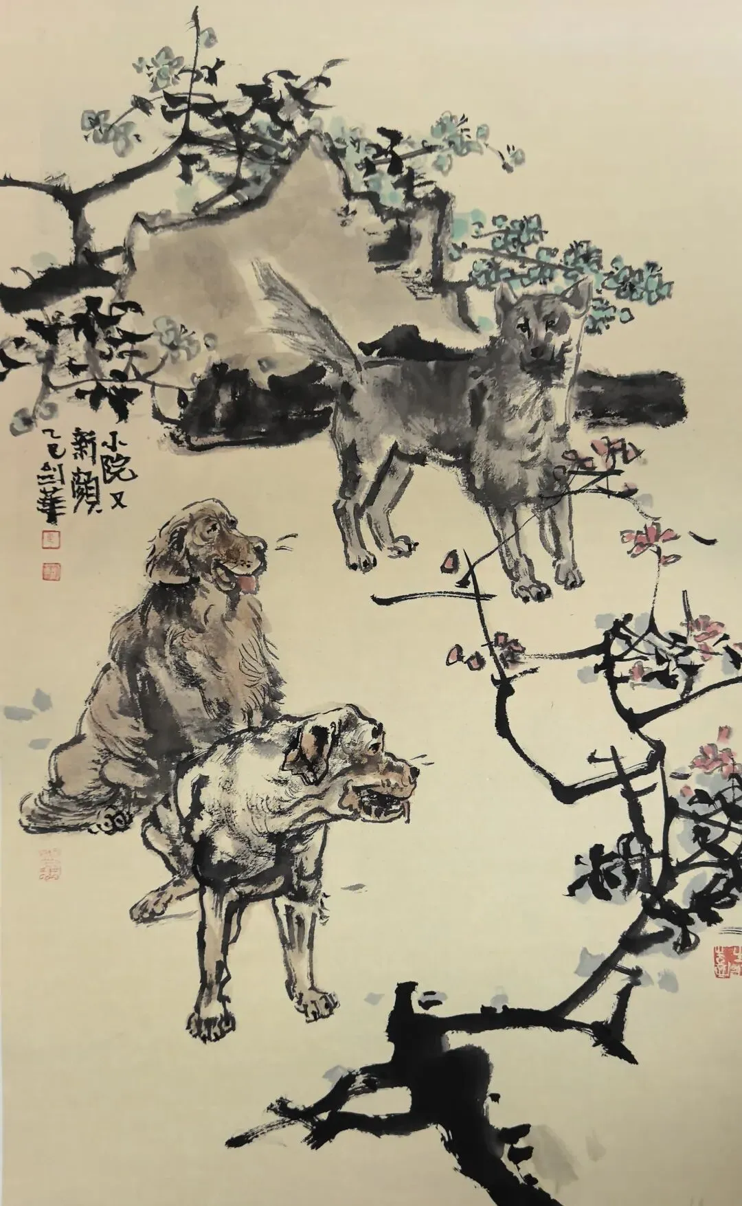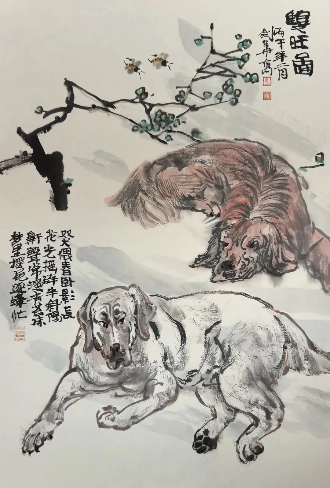 韦剑华向来以人物画著称。近来闲散无事,只管院内花草和狗娘狗崽们。剑华笔下的狗亲切如人。或躺或追或立或坐,几如成精成人。剑华养狗已不知数年,对狗之习性自然了然于胸。故其伸腰曲腿摇头摆尾莫不活灵活现。昔顾恺之云:“四体妍蚩,本无关于妙处;传神写照,正在阿堵中。”剑华笔下的狗无论闭目或是盯物,甚至追逐打闹,狗眼皆自有光。何以如此精彩,宋代那个卖油翁说:“我亦无他,惟手熟尔。”剑华之狗大抵如此。