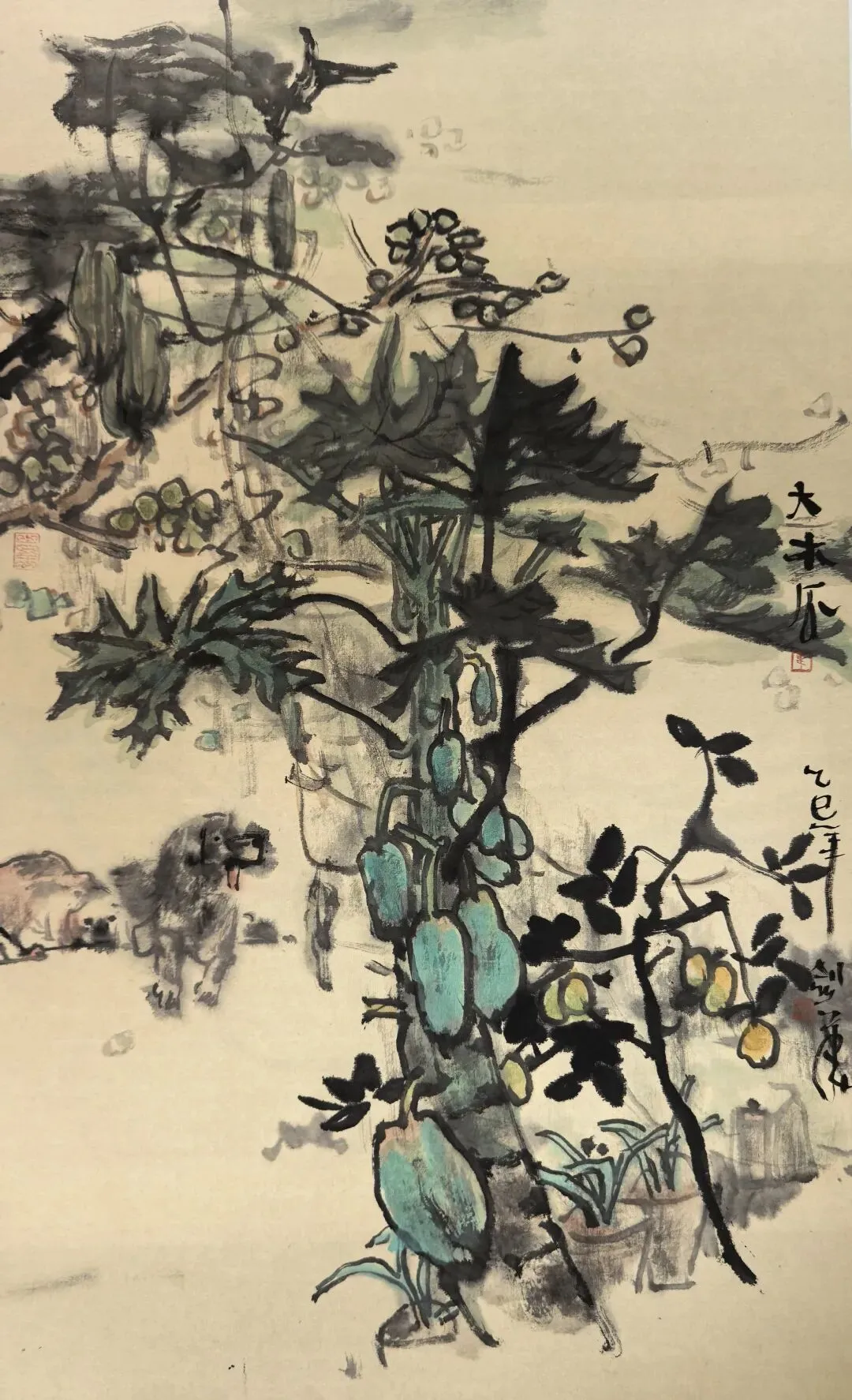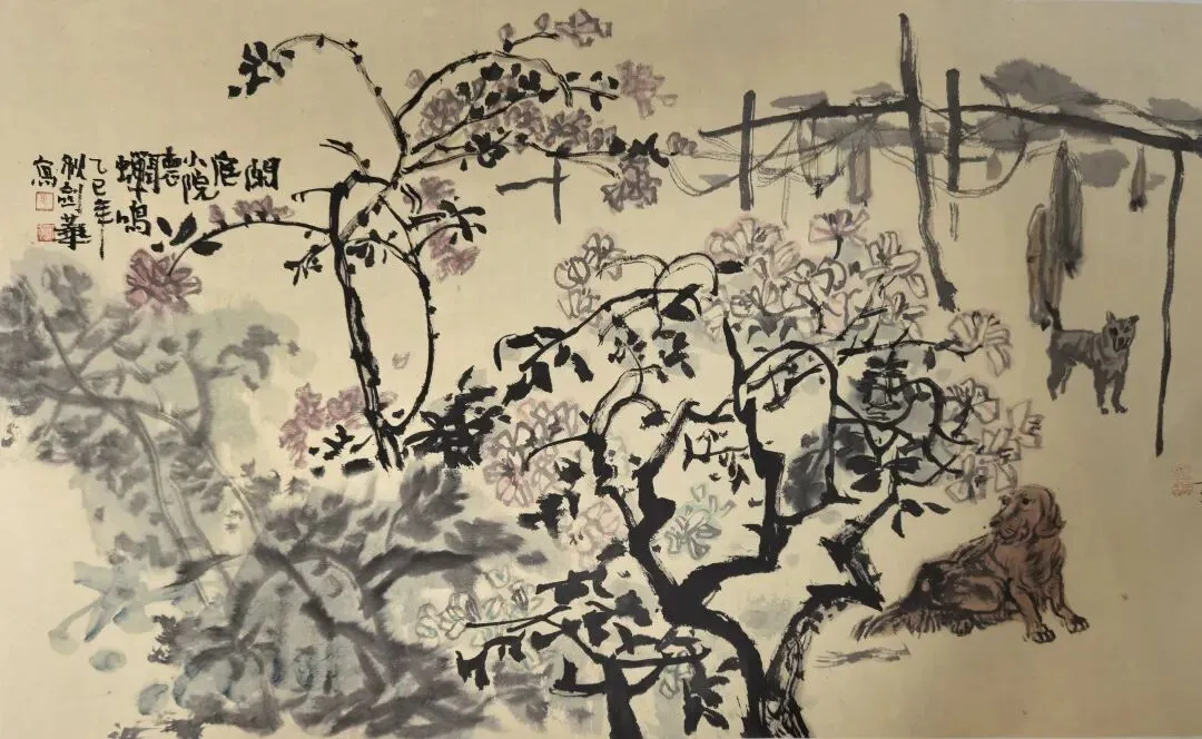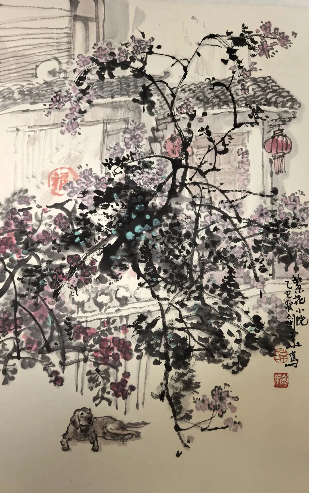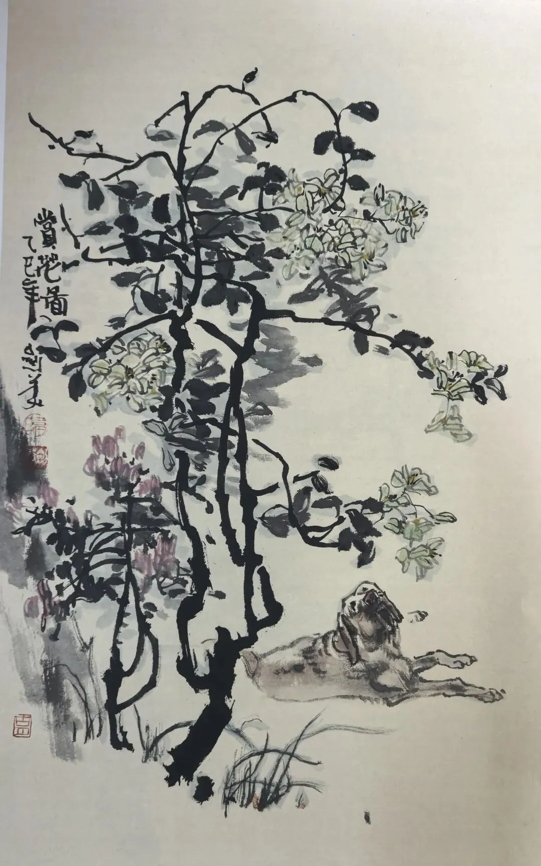 韦剑华向来以人物画著称。近来闲散无事,只管院内花草和狗娘狗崽们。剑华笔下的狗亲切如人。或躺或追或立或坐,几如成精成人。剑华养狗已不知数年,对狗之习性自然了然于胸。故其伸腰曲腿摇头摆尾莫不活灵活现。昔顾恺之云:“四体妍蚩,本无关于妙处;传神写照,正在阿堵中。”剑华笔下的狗无论闭目或是盯物,甚至追逐打闹,狗眼皆自有光。何以如此精彩,宋代那个卖油翁说:“我亦无他,惟手熟尔。”剑华之狗大抵如此。