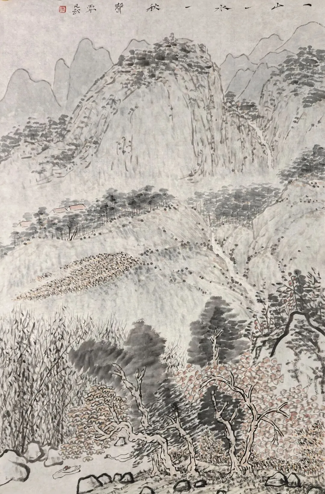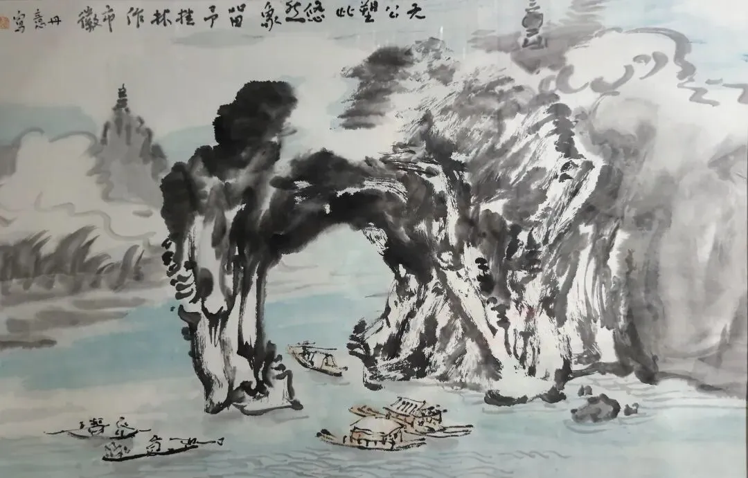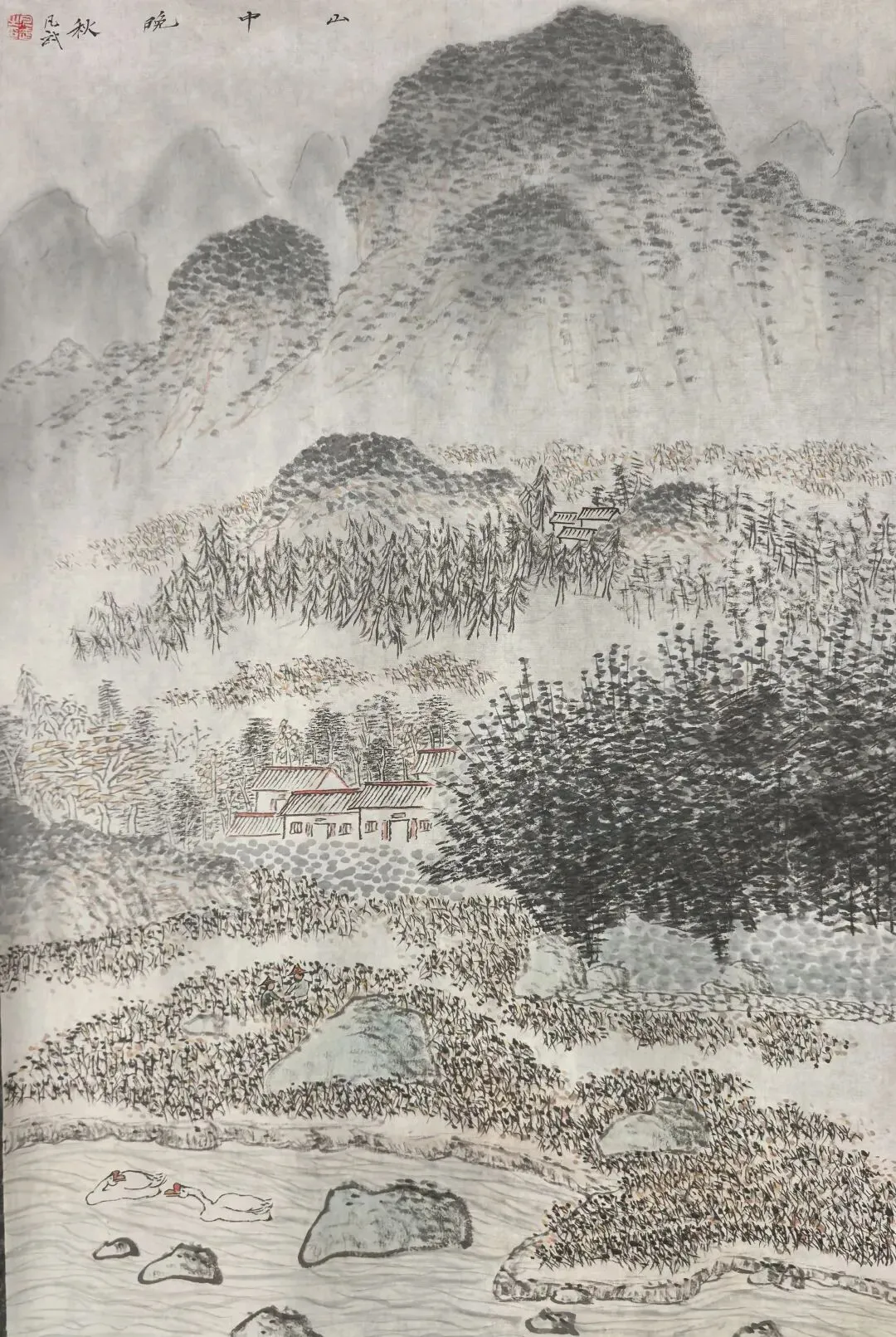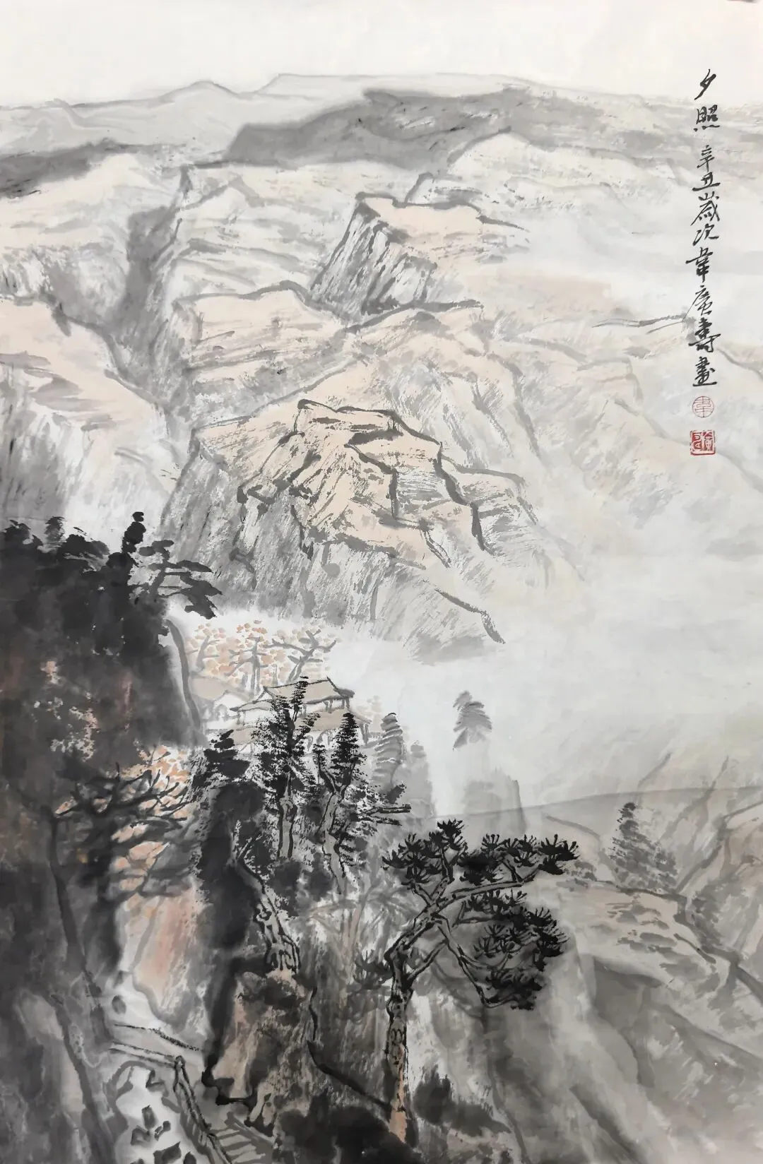韦丹意一辈子皆以粗头乱服示人。然大智若愚,诗书画印无所不能,放眼八桂,唯此子一人尔。丹意之画三科并驱,而以山水为冠。其山水多以草书起势,大有刘邦《大风歌》之“大风起兮云飞扬”的气概。故所作山水皆是一笔生发,一生二二生三三生万笔,千笔万笔终归一笔。丹意一心丹青,事不旁骛。故自诗明志:“昌硕白石与宾虹,诗书画印胜天工。我于艺道追不舍,皓首穷通报三翁。”