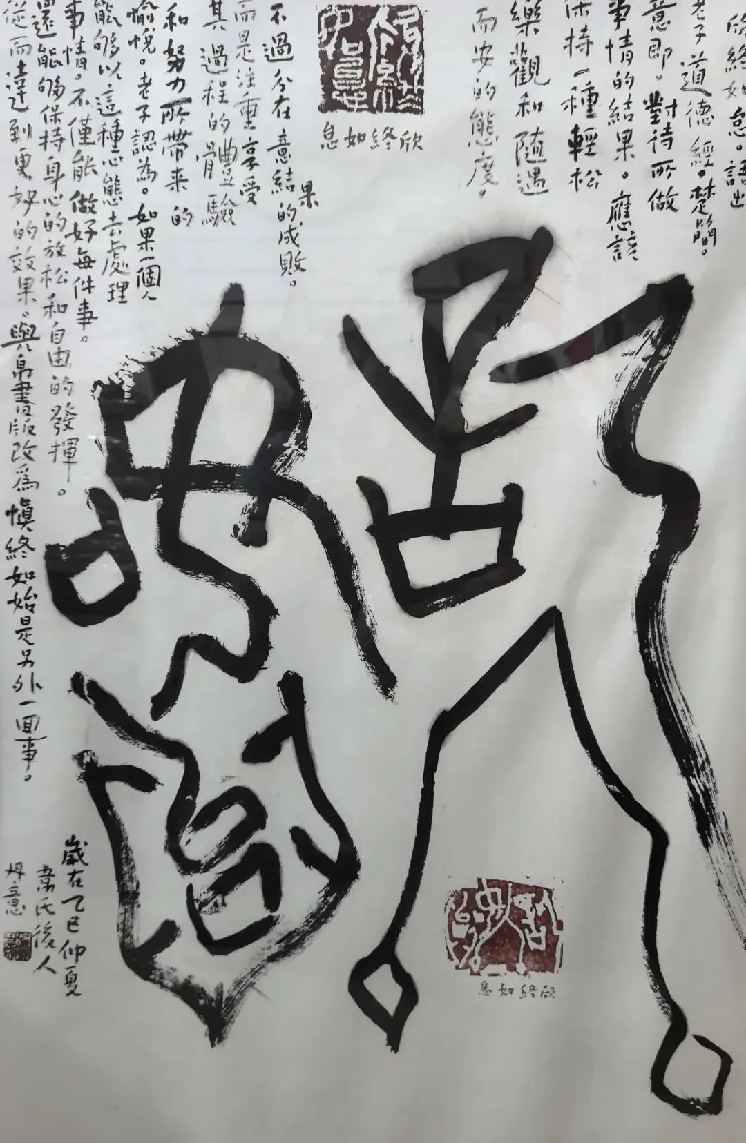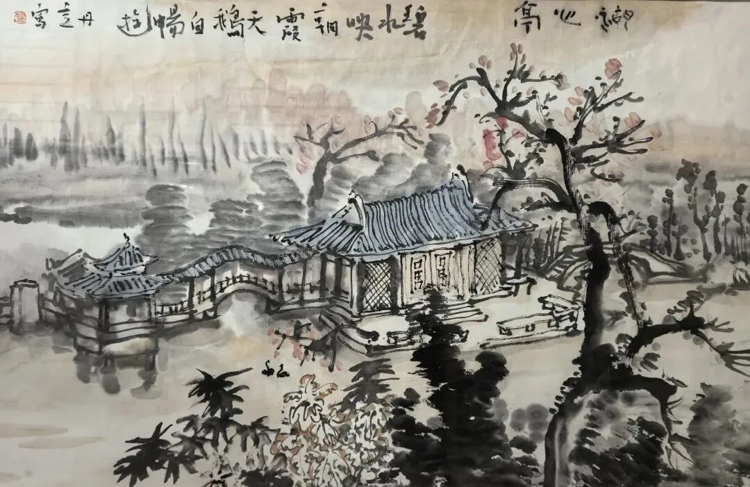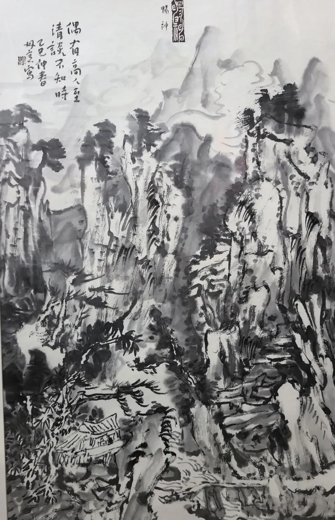韦丹意一辈子皆以粗头乱服示人。然大智若愚,诗书画印无所不能,放眼八桂,唯此子一人尔。丹意之画三科并驱,而以山水为冠。其山水多以草书起势,大有刘邦《大风歌》之“大风起兮云飞扬”的气概。故所作山水皆是一笔生发,一生二二生三三生万笔,千笔万笔终归一笔。丹意一心丹青,事不旁骛。故自诗明志:“昌硕白石与宾虹,诗书画印胜天工。我于艺道追不舍,皓首穷通报三翁。”