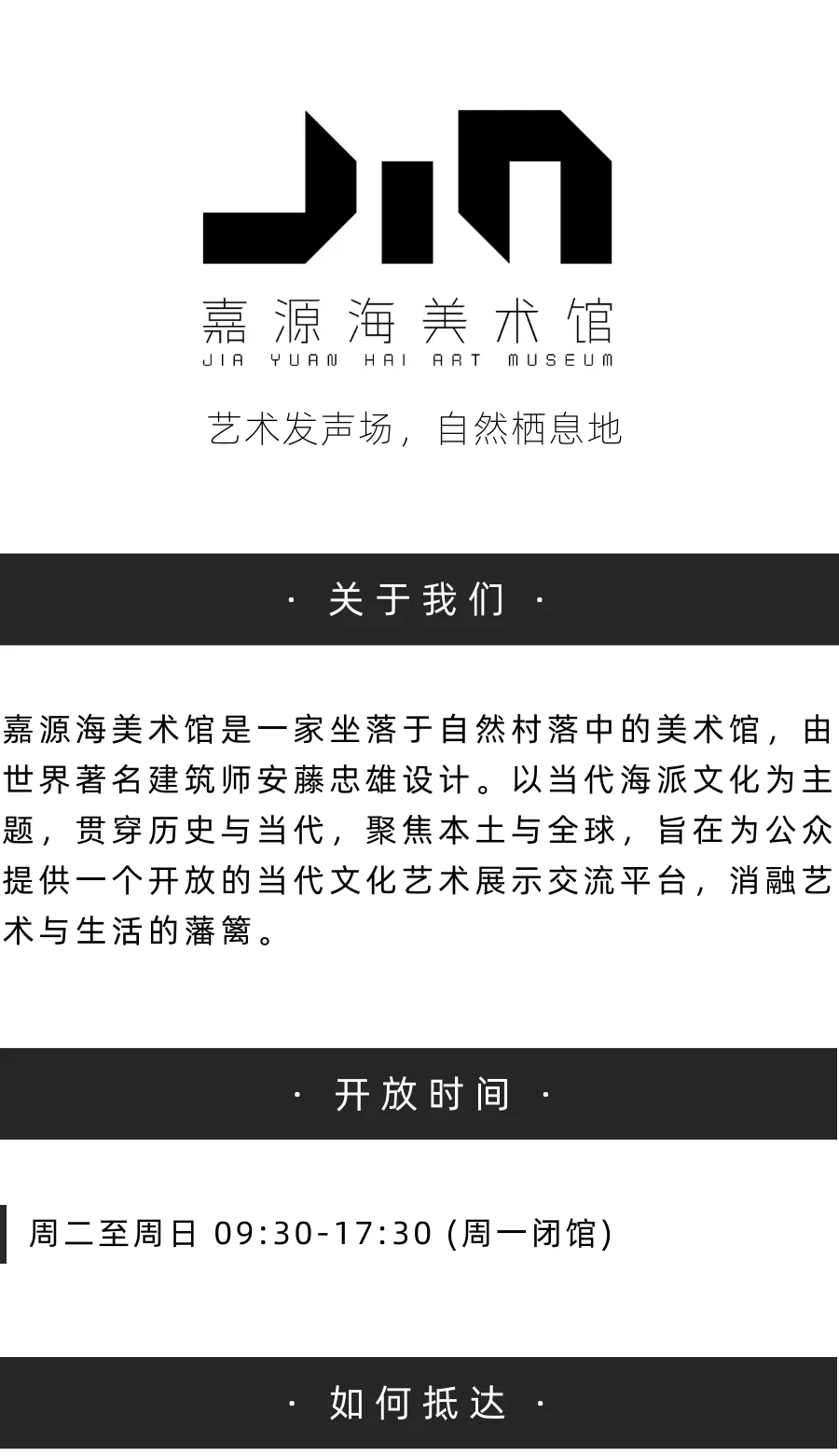 自驾前往的朋友可优先选择沪嘉高速、绕城高速,经由浏翔公路或月罗公路驶向大治路,直接导航至嘉源海美术馆指定停车场,轻松解决停车顾虑。