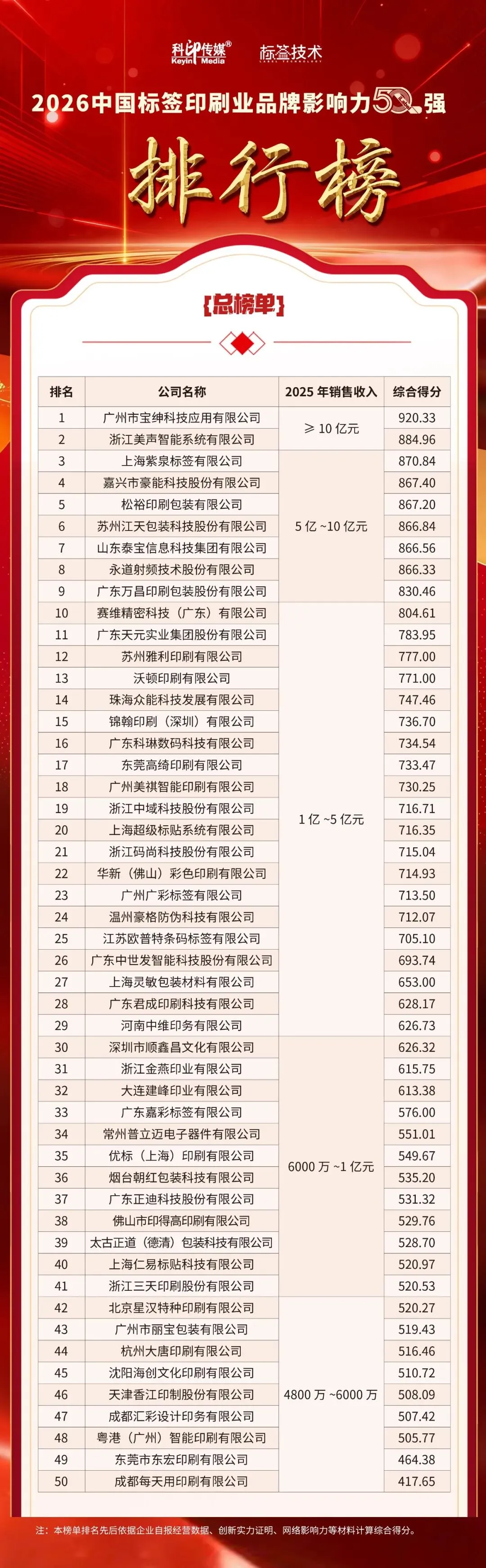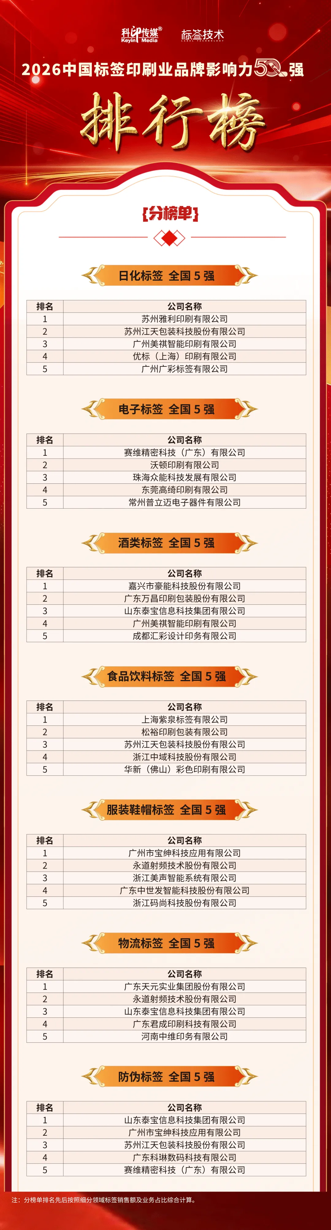 作为标签印刷行业极具影响力的年度评选活动之一,自2022年《标签技术》发起首届标签50强评选以来,至今已连续发布五届榜单。本届标签50强评选,依然采用企业自主申报,各地行业协会推荐方式进行,历经数月的全面征集、多轮筛选、数据核验与统计,兼顾企业经营实力、技术创新能力、市场口碑等多重维度,最终发布标签50强总榜单,同时聚焦标签应用核心场景,权威揭晓日化标签、电子标签、酒类标签、食品饮料标签、物流标签、服装鞋帽标签、防伪标签7 大细分领域全国五强企业分榜单。