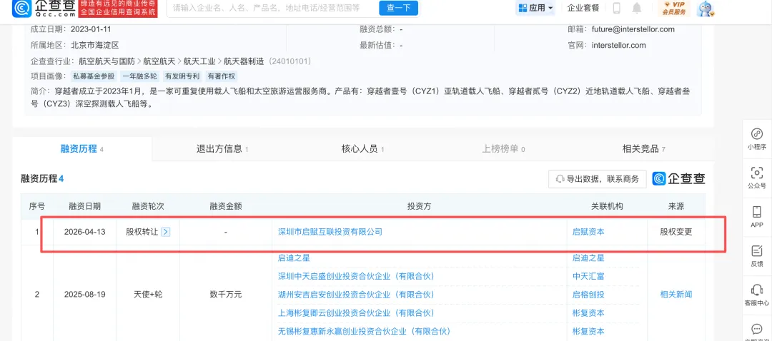 公开资料显示,穿越者成立于2023年1月11日,是中国首家集可重复使用载人飞船研制与太空旅游运营为一体的商业航天企业,创始人、CEO为雷诗情。据媒体报道,她此前曾是央视《逐梦太空》商业航天专题系列片的主持人。公司计划3-4年首先完成亚轨道可重复使用载人飞船研制,旗下的“穿越者壹号(CYZ1)”预计将在2028年实现载人首飞,这也是国内首艘商业载人飞船。