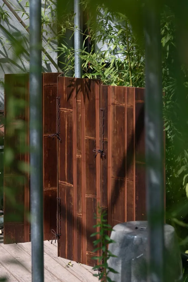 取意陶渊明「采菊东篱下」的隐逸诗境,【东篱屏风】以竹为界营造静谧空间。单扇仅6毫米,采用传统穿线工艺串联天然竹展开板,保留竹青纹理。层叠竹片在透光与遮蔽之间形成空间层次,呈现含蓄悠然的东方意境。
