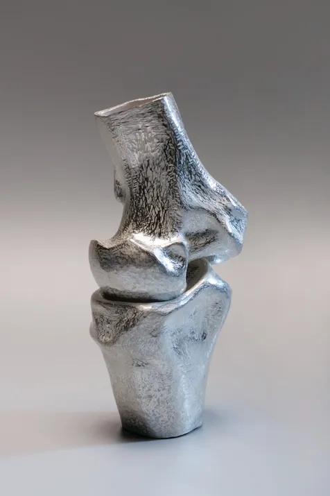 作品【骨器】以肘关节与膝关节为灵感,将支撑身体的骨架转化为中空器皿,重新阐释老子「有之以为利,无之以为用」的思想。骨的形态被锻造为空间结构,使「无」从缺席转化为器物的核心价值。作品采用纯银全手工锻打,关节部分可开合并调节角度,在结构支撑与使用功能之间形成可变的动态关系,使器物在不同状态中持续生成其使用方式。