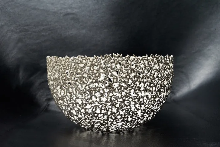 稻米不仅是食物,更是一种维系社会与秩序的根本力量。作品将数以千计的银质米粒手工锻打、熔接成碗。它致敬的是稻谷所代表的、支撑文明存续的最基本单元。银赋予了稻谷一种跨界触感,升华为稻作文明的纪念。作品被赋予生命的温度与重量,传达出每一粒米皆贵比金银的民族传统思想。