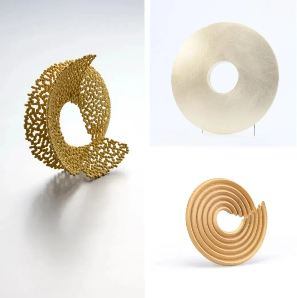 将玉璧的形式转译为当代金属作品,以现代工业材料镀金铝与镀金银作为材料,把玉曾承载的象征意义附着于金属物质之上,延续跨越千年的造型连续性。