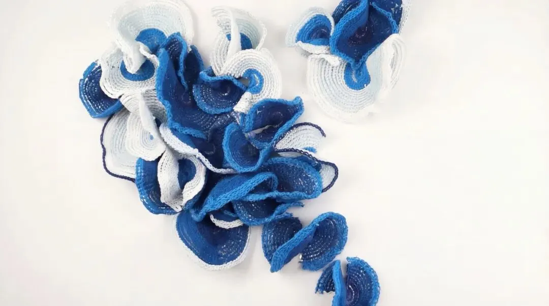 【可编程的钩织作品】融合传统钩编与数字制造,提出低门槛的三维织物成型方法。其核心为毛线与POF热缩薄膜的复合结构:路径经数字生成并激光转译,仅需基础链式针法即可完成编织。加热后薄膜收缩,结合正反面密度差形成非对称张力,使平面结构卷曲成型。该方法以简易操作实现复杂形态,连接数字设计与手工织造。