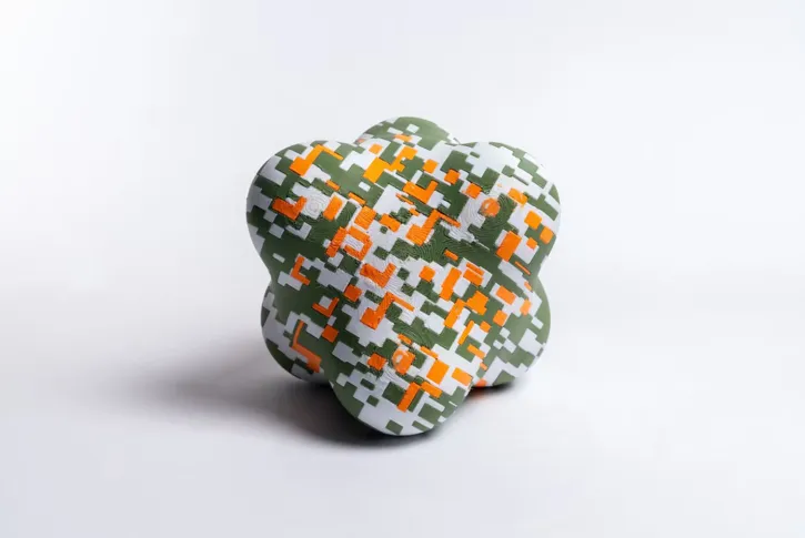 作品以良渚文化为原点,从其高度发达的纹织工艺与独特的色彩体系中提取视觉基因,通过计算机编程将纹样结构与色彩关系进行数字化转译。以茶叶渣、橘皮渣以及废弃贝壳粉为基底,通过物理粉碎、配比调试与黏合剂筛选,研制出适用于3D打印的生物基材料。