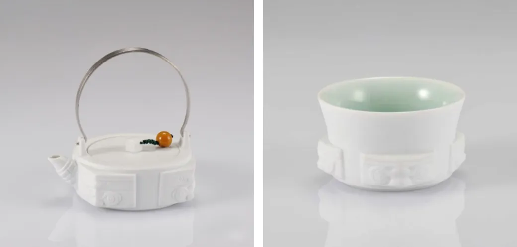 作品【四方如意·茶具】以良渚玉琮为原型,将「天圆地方」的宇宙观转译为日常器用。壶与杯以方正外形包裹圆形内腔,形成内外对照的结构关系;器身环饰神人兽面纹,延续礼器的精神象征。作品采用玉青与玉砂质感,通过雕刻工艺强化纹样层次,使古老的通天意象融入饮茶行为之中,在使用中传递东方哲思与吉祥寓意。