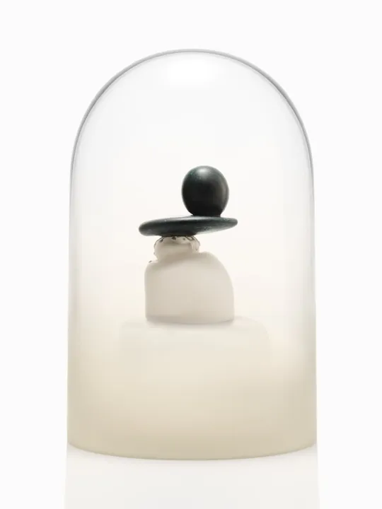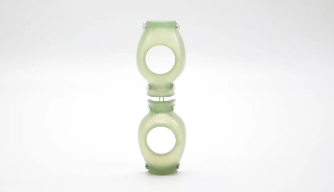 作品以良渚文化玉器的「孔」为核心意象,通过双玉相对与中轴连接的结构关系,转译古代礼器所承载的宇宙观与空间意识。孔不再只是器物的功能性开口,而成为贯通内外的视觉通道。以玉为材,传统器物造型被解构成对半的瓶子,孔对瓶身的穿透构建出一个新的空间关系:内外互通、虚实相生,使观者的视线在孔与孔之间往复穿行。传统不作为被再现的图像存在而成为被重新体验的空间关系。