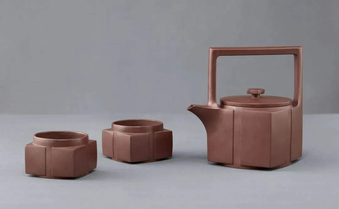 作品【雅琮提梁壶】以良渚玉琮为原型,将「外方内圆」的礼制形态转译为紫砂茶器。壶体方正而温润,线条简练,体现「刚柔并济」的东方哲思;壶把与壶身暗接一体,强化整体秩序与节奏。玉琮原为沟通天地之器,茶器承载人文礼序,二者在日常使用中形成呼应,使器物成为连接传统礼制与当代生活的文化媒介。