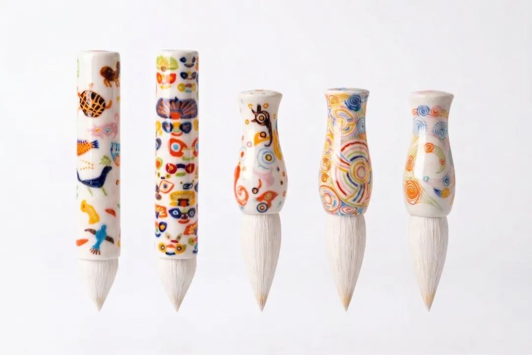 作品【良渚·相】为儿童书写设计毛笔,笔杆以景德镇高温陶瓷制成,笔头延续传统羊毫工艺。设计以良渚刻符、神人兽面纹等文化符号为灵感,通过手绘釉料转译为当代图形语言。优化鸡距笔与斗笔形态,使儿童更易稳定握持,并在触感与图案互动中获得书写乐趣。