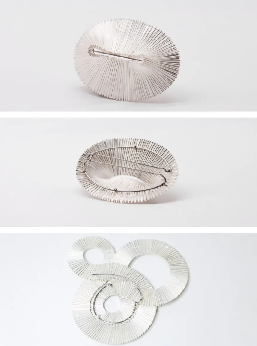 作品【循】系列提取良渚神徽羽冠的放射纹与旋纹为视觉语汇,以细密线条构建层叠肌理,将「天圆地方」与「循环往复」的观念融入创作。通过金属折叠工艺,使平面在弯折与展开中生成连续变化的形态,强化循环的感知。作品以抽象转译古老符号,在当代首饰语境中重构秩序与生命的关系。