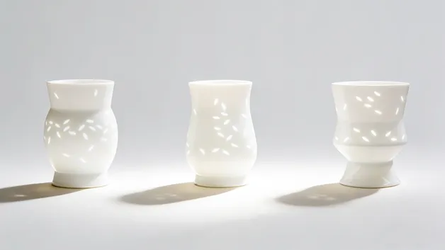 作品【良渚千盏】以良渚遗址出土器物的轮廓比例为基础,提取其稳定、内敛的器型结构,并以玲珑瓷的透光特性,将「稻谷」这一文明原点转化为当代日用杯器。杯体采用薄胎玲珑瓷制作,三种不同器型对应三类茶的饮用特性。器型差异并非装饰变化,而是基于香气扩散方式、保温性能与入口集中度的设计选择。