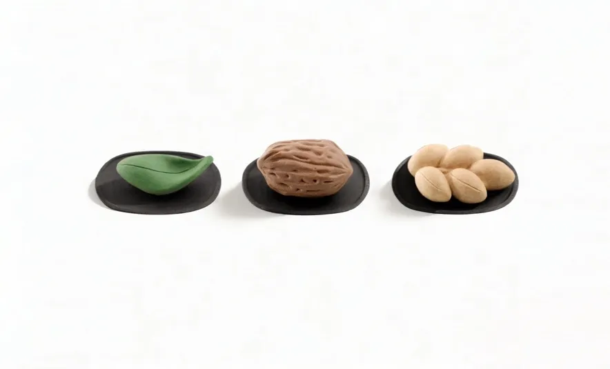 作品【香自千年来】是一套以良渚遗址文明为文化源点的陶泥扩香器设计。作品以「香」为媒介,回望土地、器物与时间之间绵延不绝的关系,尝试将史前文明中朴素而深刻的生活智慧,转译为当代可感知、可使用的嗅觉与器物体验。整套作品由三枚陶泥扩香石、三只黑陶托盘与三瓶对应香型的扩香精油构成。扩香石造型取自桃核、水稻与茶叶三种具有象征意义的自然意象。