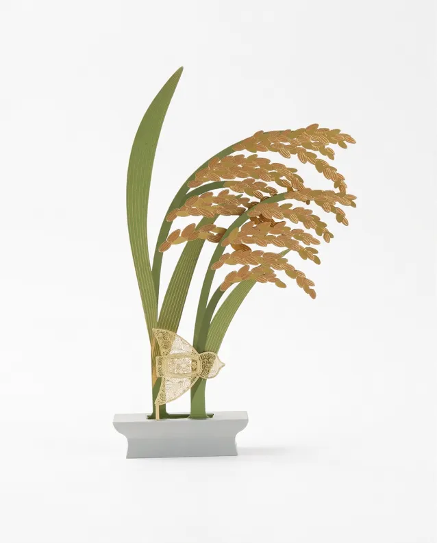 作品【稻香生生】是一件为良渚文化创作的当代扩香器。作品以「稻作文明」为线索,将水稻意象转化为可吸收精油并缓慢挥发香气的纸雕结构,置于金属花瓶底座之上;瓶身一侧结合良渚玉鸟纹金属装饰,使自然生长的稻穗意象与文明符号并置。作品阐释了良渚文化中与土地、农耕和生命繁衍相关的精神内涵。