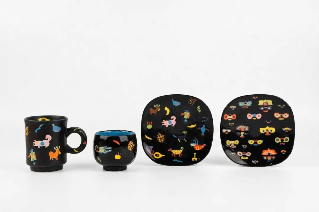 作品【良渚·玄】是一组灵感来自良渚黑陶,并以良渚文明视觉符号为核心的当代日用器物设计。设计将良渚刻符与神人兽面纹以更自由、明快、亲切的风格重新绘制,通过釉下彩工艺与景德镇高温烧制,使古老符号转化为高饱和度的现代视觉语言;成品兼具卓越的耐用性与实用安全性。