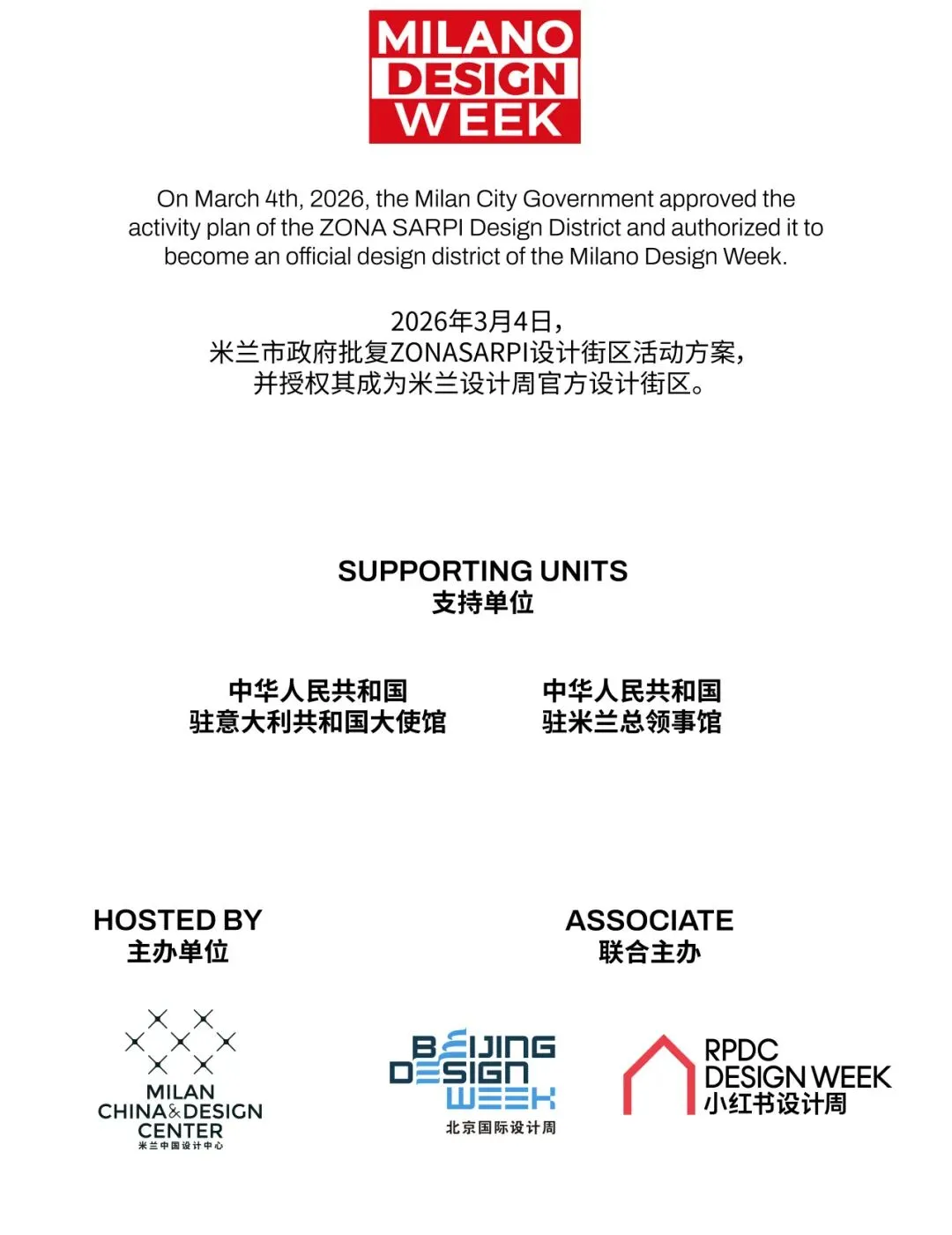 在米兰市政府书面批准和中国驻意大利大使馆、中国驻米兰总领事馆的支持下,由米兰中国设计中心、北京国际设计周、小红书设计周联合主办的2026米兰设计周中国周活动,将在意大利米兰ZONA SARPI设计街区举办。