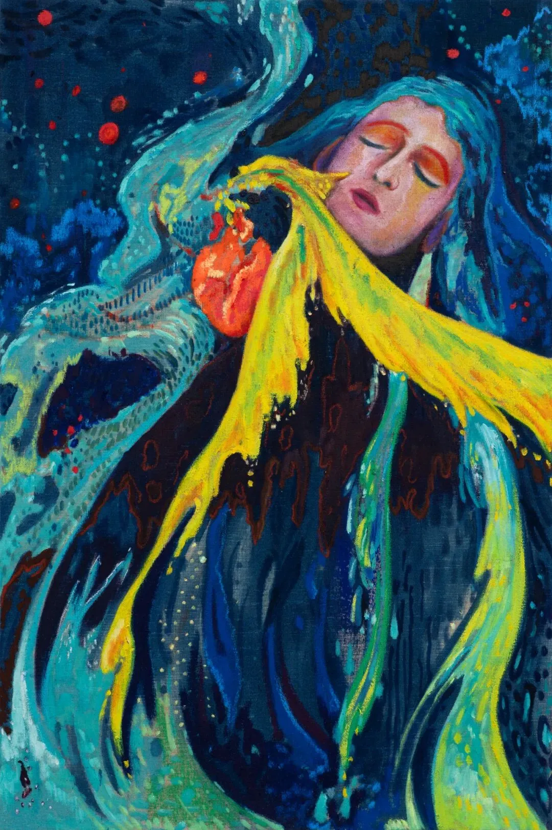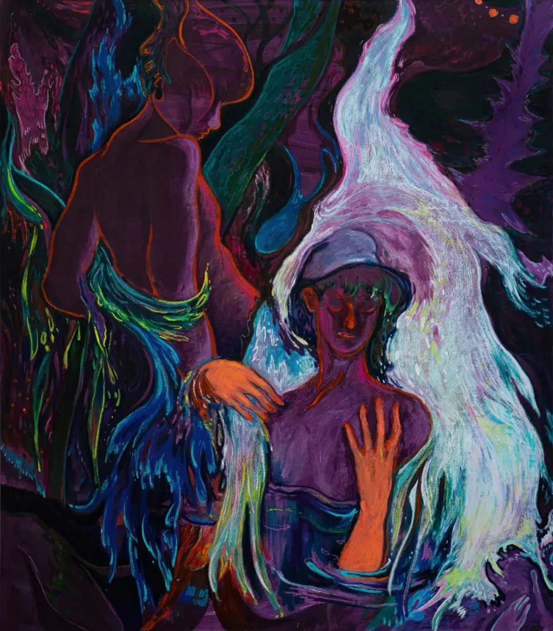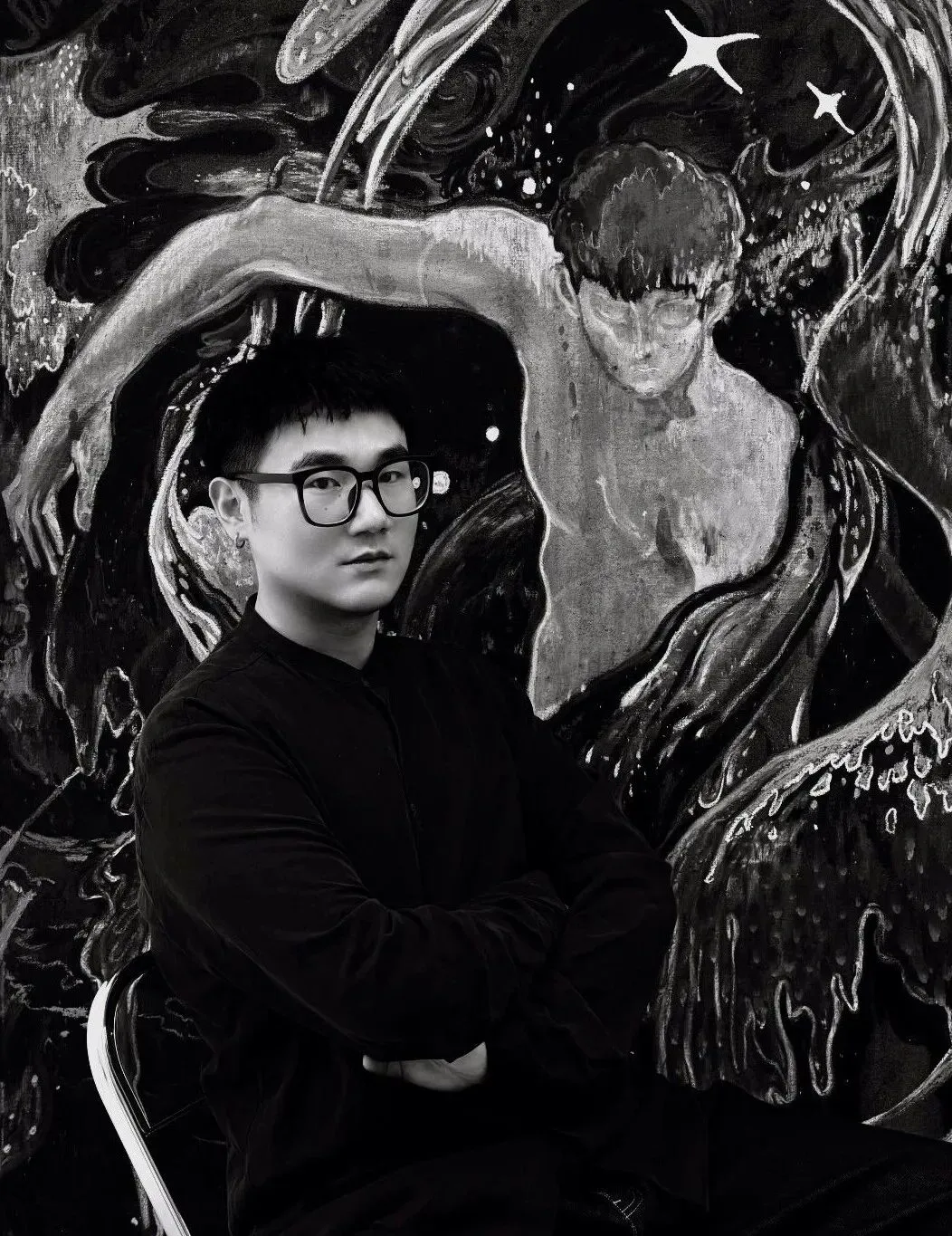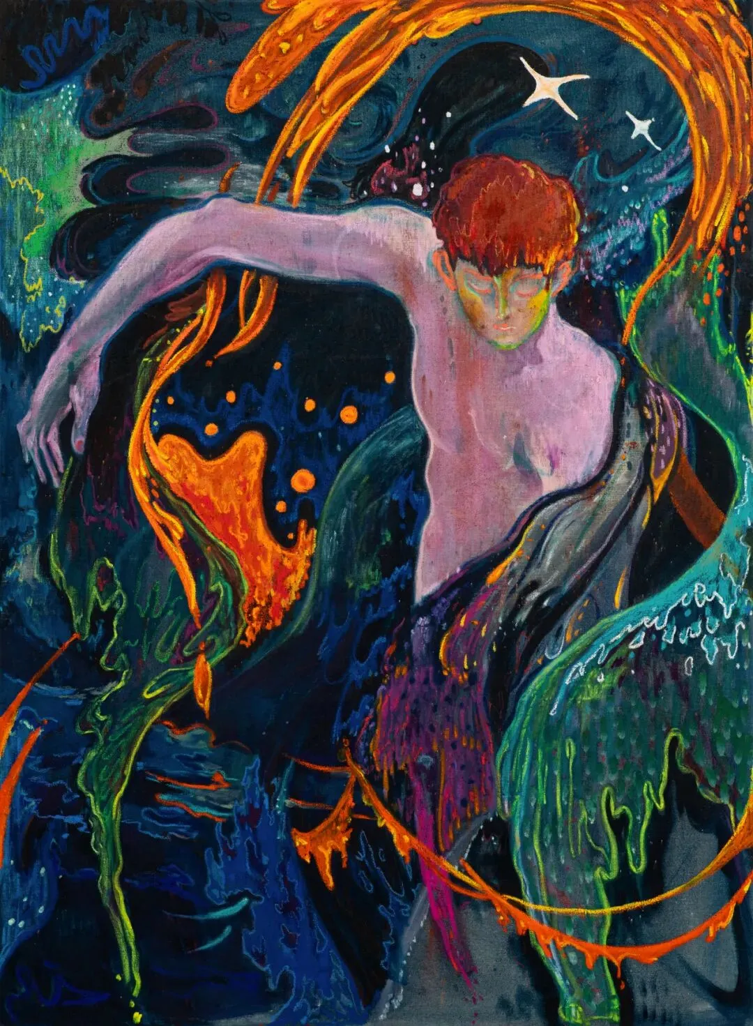 In Ecstasy (2025), interwoven bodies within flames form a structure that is both oppressive and entangled. The central figure is enveloped within this configuration, entering a near self-forgetting state of immersion. Warmth and harm unfold simultaneously within the same field, making perception difficult to clearly distinguish. Obsession (2026) employs flowing lines and uncanny figures to probe the internal dynamics of desire; within cascading, waterfall-like light, a fleeting moment emerges—one in which the subject perceives its own void. In Deep Night Fills the Sky (2026), fractured wings and viscous, heavy chromatic matter articulate the persistence of trauma. The weight of life becomes almost materialized, while a blood-red sky establishes an inescapable condition of suffering.