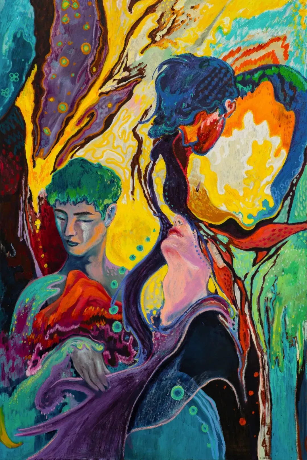 作品《沉沦》中,火焰里交错的身体构成一种持续压迫又彼此缠绕的结构,中心人物被包裹其中,呈现出近乎忘我的沉浸状态;温暖与伤害在这一场域中同时发生,使感知难以被明确区分。《沉迷》通过流动的线条与妖异的形象指向一种对欲望的内在剖析,在如瀑布般倾泻的光线之中,映射出“看见自身虚无”的瞬间。《大夜弥天》以断裂的羽翼,黏稠而滞重的色彩展现创伤的滞留,生命的重量以近乎物质化的方式显现,血红色的天空映照出一种无法回避的伤痛。