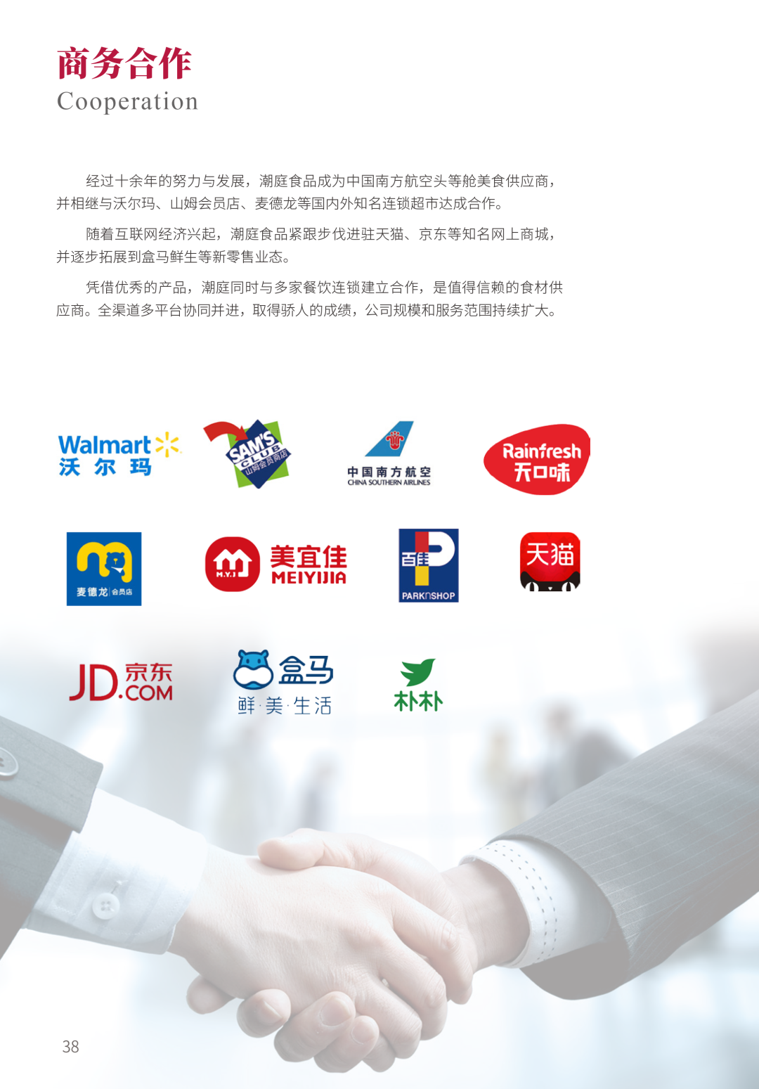 经过十余年的努力与发展,潮庭食品成为中国南方航空头等舱美食供应商,并相继与沃尔玛、山姆会员店、麦德龙等国内外知名连锁超市达成合作。随着互联网经济兴起,潮庭食品紧跟步伐进驻天猫、京东等知名网上商城,并逐步拓展到盒马鲜生等新零售业态。