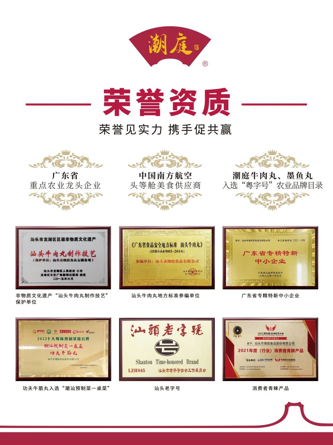 优秀的产品品质、领先的综合服务能力和全面的可持续发展能力,让潮庭食品一直深受各级政府和社会各界的信赖与认可,获得“高新技术企业”、“广东省重点农业龙头企业”、“广东省专精特新中小企业”、“汕头市侨胞之家”等荣誉称号。从2021年潮庭食品签约世界举重冠军蔡炎书作为品牌形象大使,同年先后成为【2021中国男子手球超级联赛】官方赞助商、【2021-2022中国排球超级联赛】官方供应商,到2022年登上北京冬奥会餐桌,潮庭食品用品质和实力换取了消费者的信任,用品牌力和产品力绽放在国际舞台上,努力实现着“潮汕美食,庭院飘香”的品牌愿景。