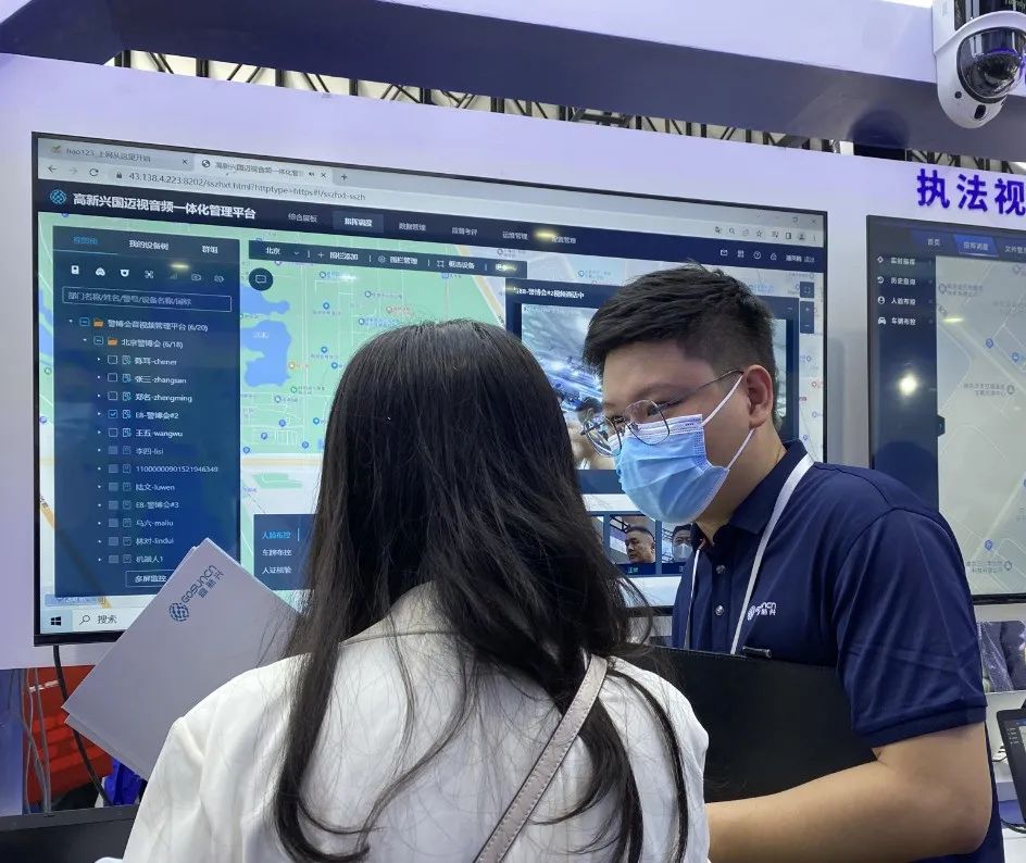 在展台上,高新兴展出了执法视音频一体化管理平台、国产化采集工作站L8、5G执法记录仪E8等装备。同时通过平台还可以与对讲机、手机、执法仪等进行互动对讲体验,欢迎来现场试音哦~