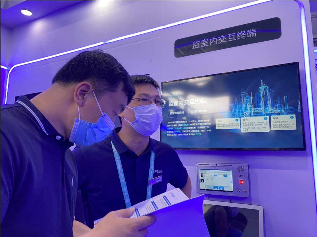 高新兴本次展示了律师视频会见室、远程提讯一体化系统、视频会见被监管人员端、省级公安监管综合数据库、监所实景指挥平台、监室内交互终端等,这些装备应用在监室、监区、服务大厅、出入口等场景,通过“平台+终端“的模式打造监管全场景的智慧应用,实现资源全接入、管理智能化、执法规范化、服务便捷化。