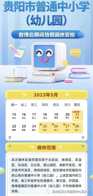 为确保2023年中国国际大数据产业博览会期间各项活动顺利进行,贵阳市教育局根据市委、市政府对花溪区、云岩区、南明区等部分区域普通中小学(幼儿园)实行放假调休安排。
