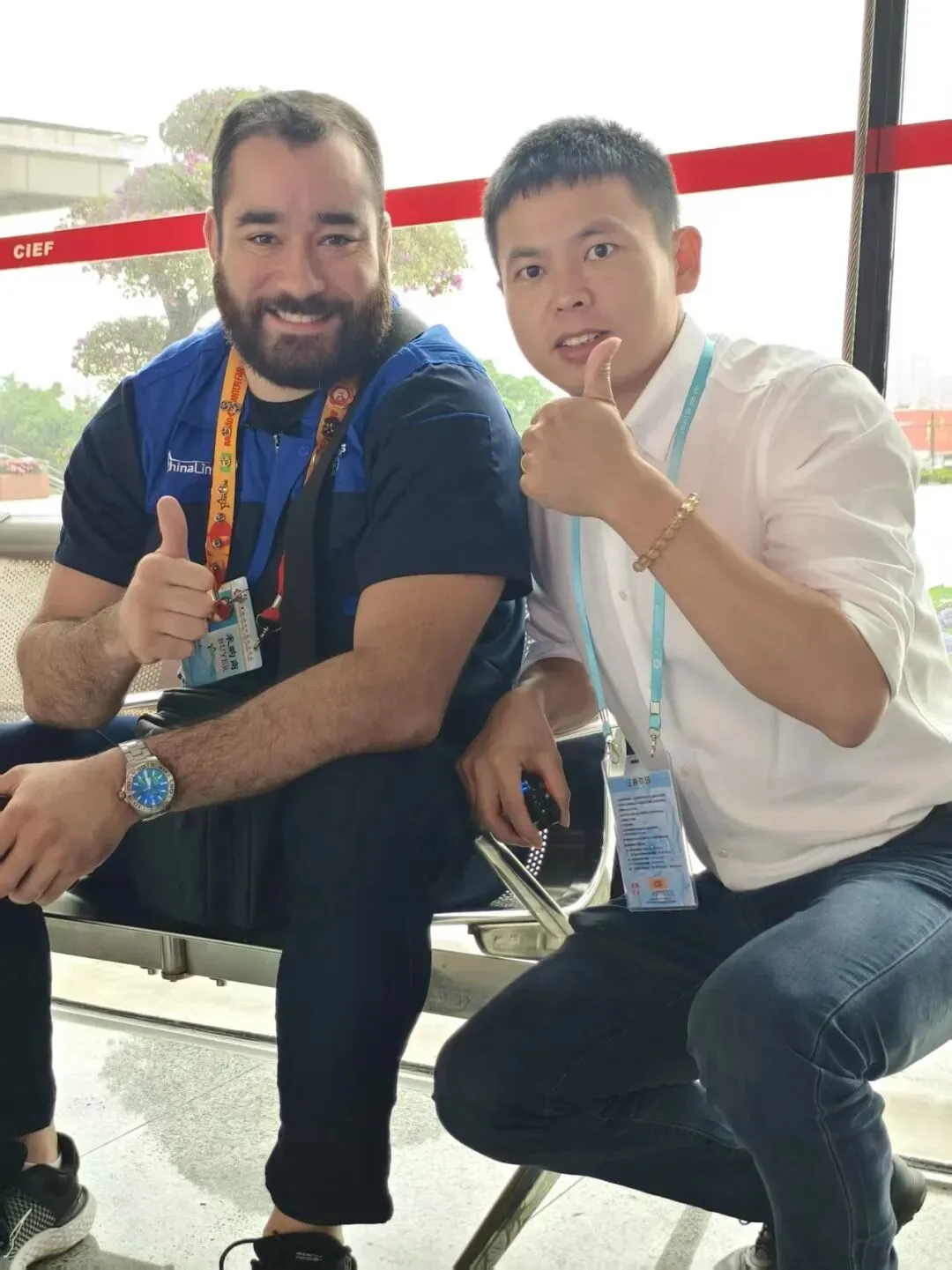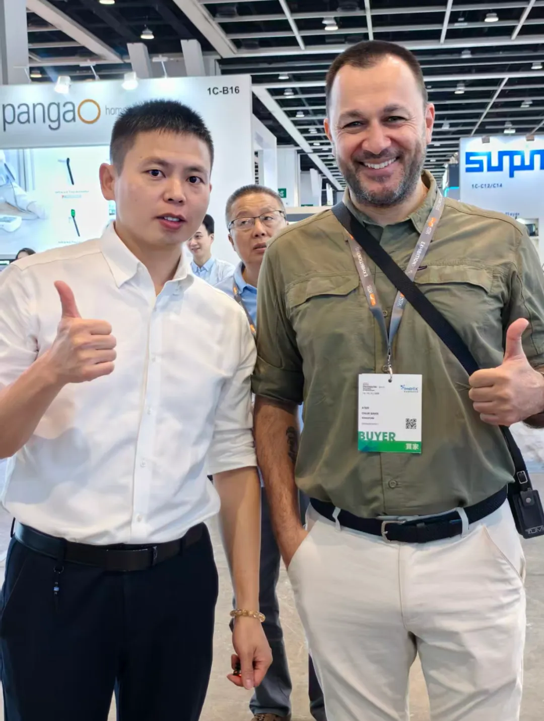 小哥全程非常热情积极的给每个过往的老外打招呼,递水,哪怕客户刚开始表现的没什么兴趣,他先一瓶水递过去,热情的打着招呼,就是我不管你如何,我先做好我自己,我的精神面貌先展示出来,剩下的随缘,我觉得是我们很多参展商欠缺的东西!