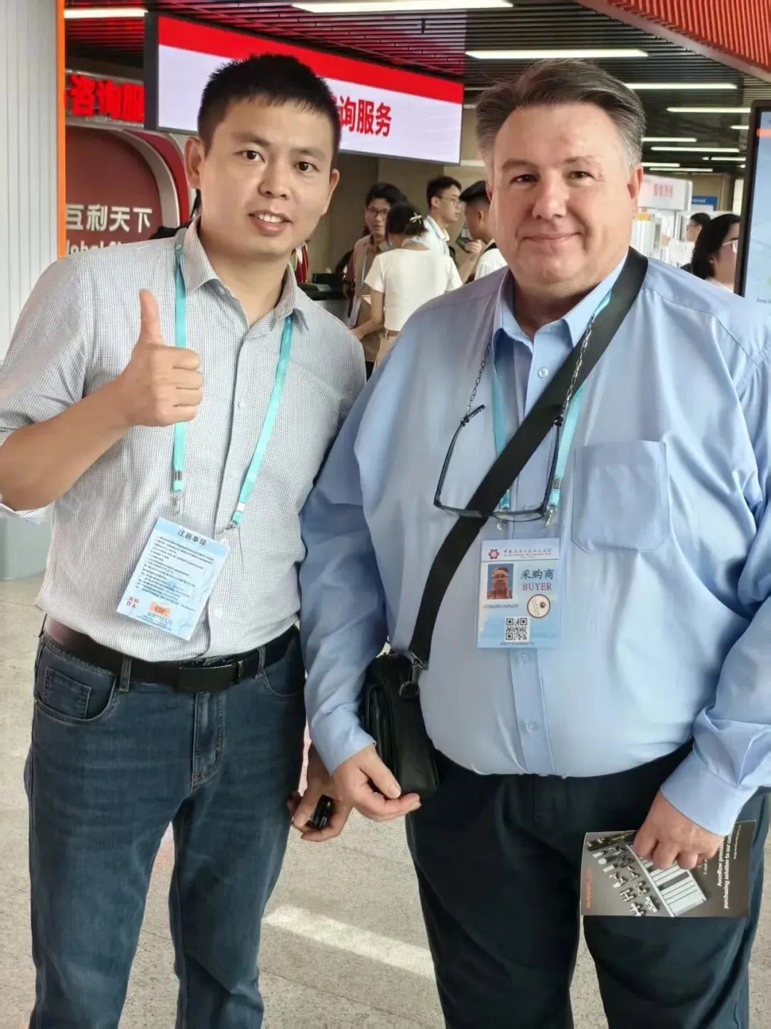 这里我想说的是,如果你摊位客户少,如果你是两个人一起过来的,答应我,别坐等客户,坐在那里等!派个人出去打打游击??去你这个产品的展馆门口“逮”老外试试?有人可能说怕被拒,怕被保安赶,怕英语不好人家听不懂,怕...各种怕。