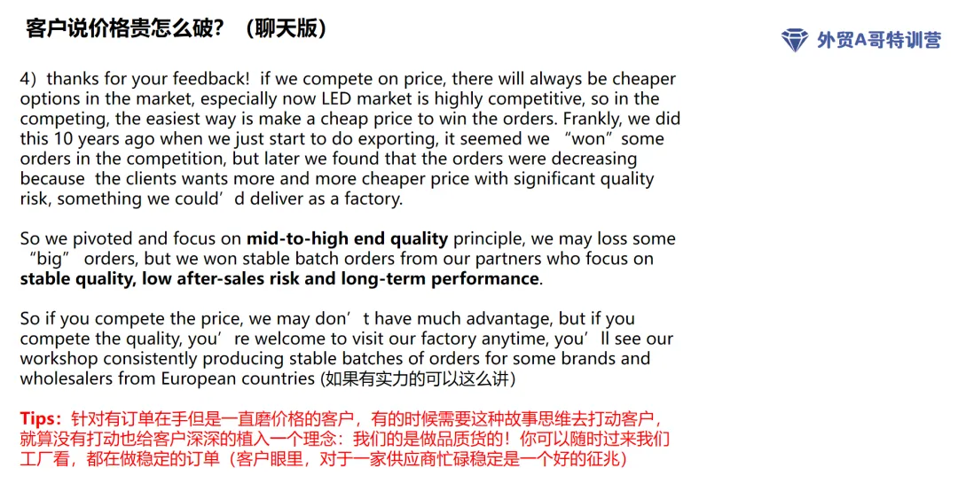 思路?:直接表明我们的立场,我们做中高端品质的,我们不是做低价位的,这种以退为进的筛选我觉得简单粗暴,对的客户留下,不对的划走!就是开发客户门当户对很重要,展会上会遇到很多客户,有的客户适合,有的客户不适合,我们要去找那些适合的客户,可能数量不多,但是值得!就像感情一样,那个对的人很重要。