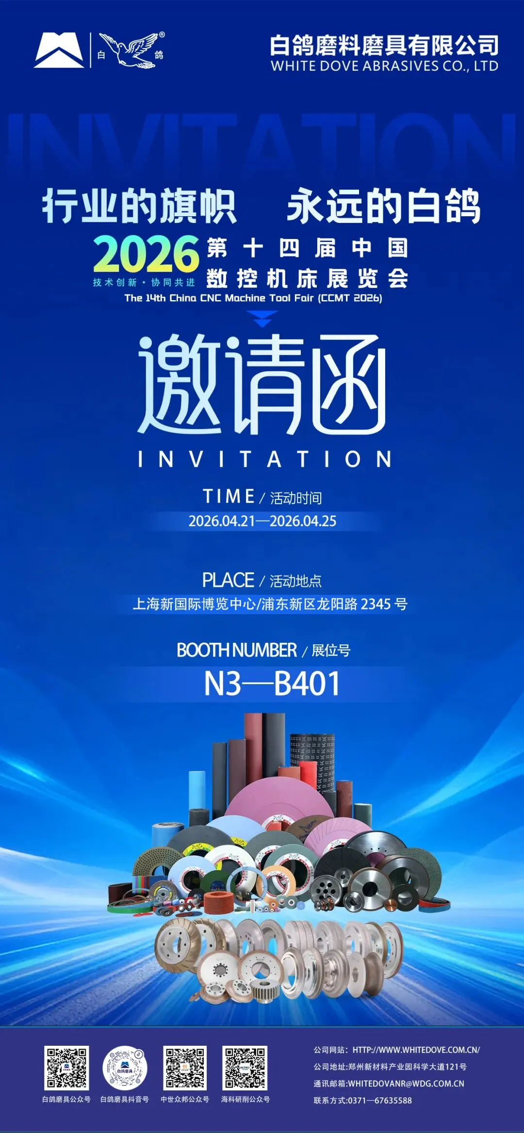 第十四届中国数控机床展览会(CCMT2026)将在上海新国际博览中心举办。白鸽磨料磨具有限公司将携旗下核心品牌亮相N3-B401展位,期待您的莅临!