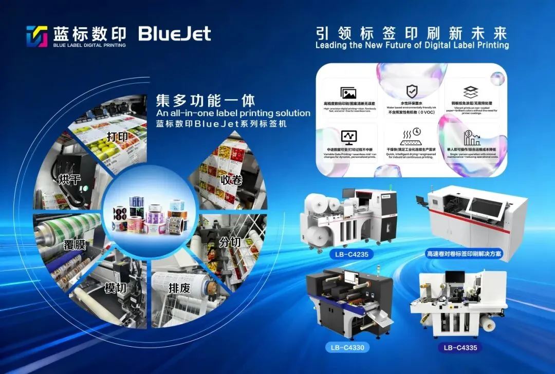 展会现场,蓝标数印核心展品——LB-C4235喷切一体智能标签机成为当之无愧的“流量担当”。这款设备打破传统标签生产“多机协作、分步操作”的固有模式,通过高度集成化设计,将印刷、模切、覆膜等八大关键工序整合至单机系统,实现从原材料到成品标签的一站式连贯生产。