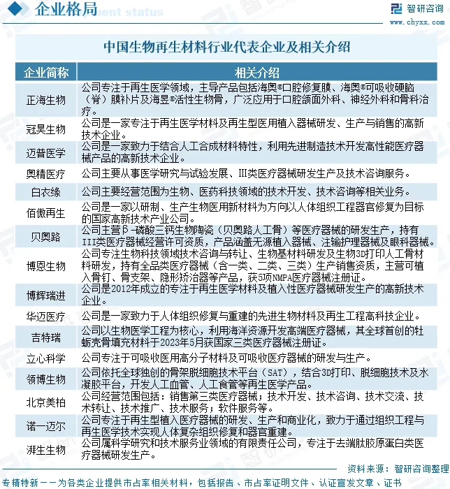 整体而言,我国生物再生材料产业自20世纪90年代中后期起步,发展至今主要集中在结构类产品领域,相关核心技术仍由国内少数具备研发优势的企业掌握,并依托各自优势在细分市场中形成差异化竞争格局。