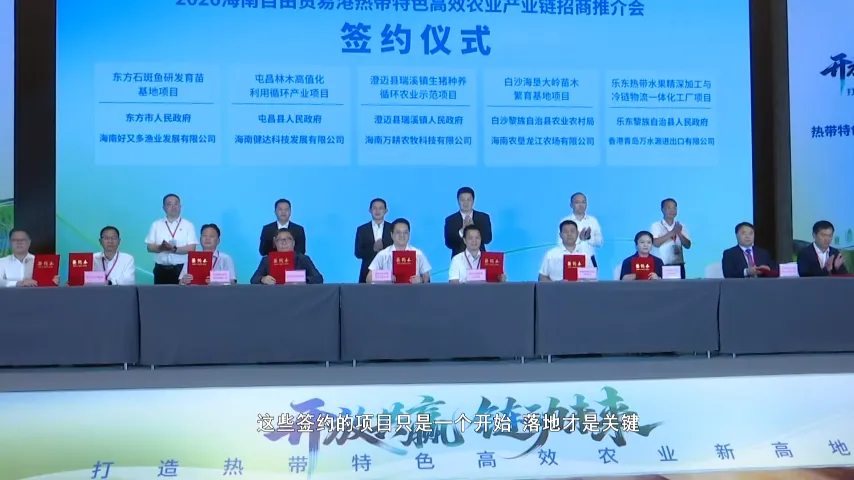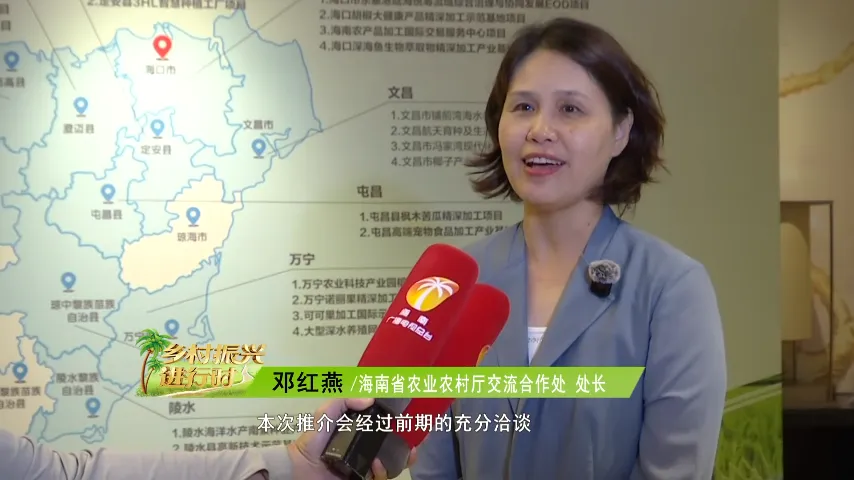 海南省农业农村厅交流合作处 处长 邓红燕:本次推介会,经过我们前期的充分的洽谈,我们促成了海口、屯昌、东方等9个市县25个项目签约,签约金额是38.33亿元,涉及的农业领域是种业、种养业还有我们农产品加工,还有畜禽等九大领域。这些签约的项目只是一个开始,落地才是关键。下一步,我们继续进行接洽和跟踪,推动项目落地。