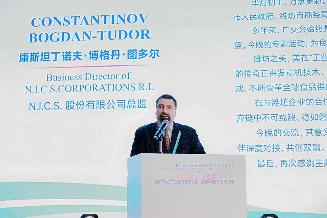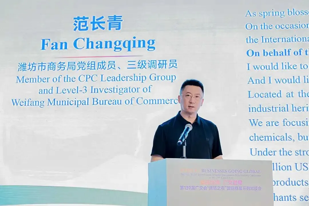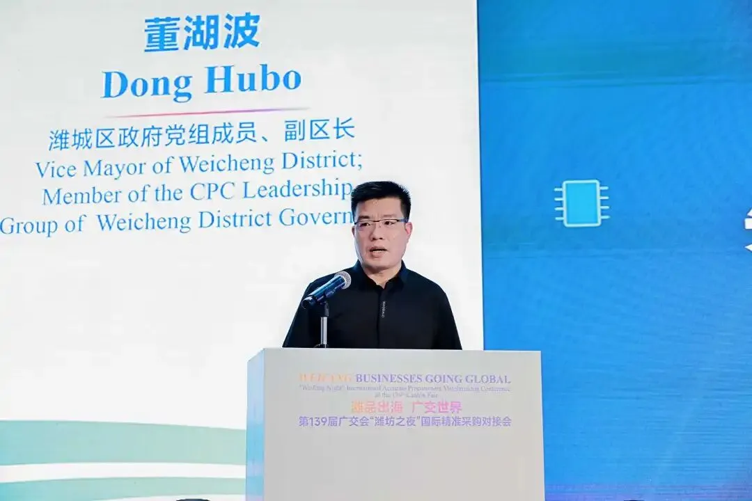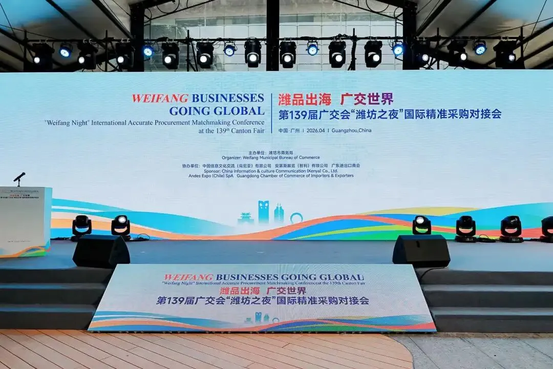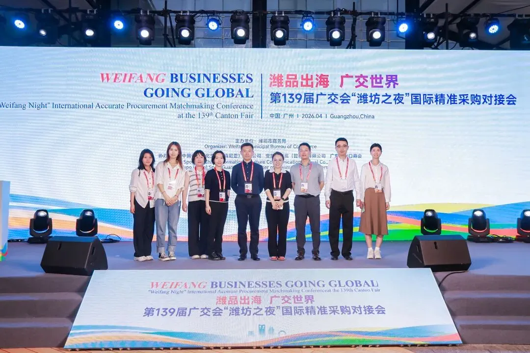 为充分利用第 139 届广交会的国际化平台资源,助力潍坊优势产业拓市场、寻合作、促发展,4 月 15 日晚,“潍品出海 广交世界” 第 139 届广交会 “潍坊之夜” 国际精准采购对接会在广交会展馆隆重举行。本次活动由潍坊市商务局主办,山东汇博国际展览有限公司承办,旨在搭建高水平对外开放桥梁,推动潍坊制造与全球市场精准对接,实现互利共赢。