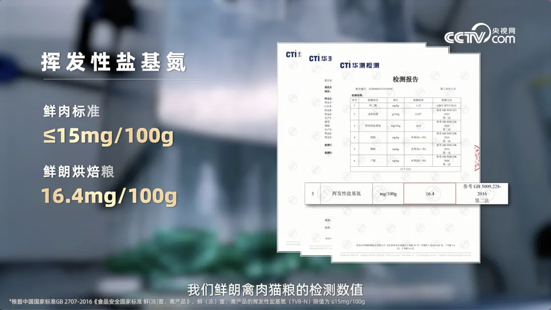 在鲜朗烘焙粮的检测报告中,生物胺均显示“未检出”。再看挥发性盐基氮(TVB-N),它是衡量肉类新鲜度的核心指标。国家标准对鲜肉的要求是≤15mg/100g,而鲜朗烘焙猫粮的实测值为16.4mg/100g。“这个数据已经非常接近鲜肉水平。这也印证了从原料到成品,鲜朗对新鲜度的把控是持续且有效的。