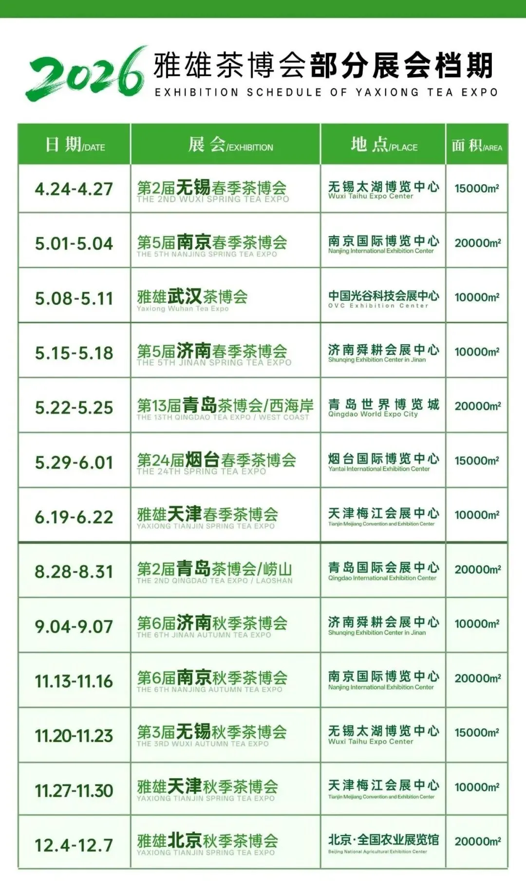 会展资讯丨2026雅雄茶博会下半年展会档期