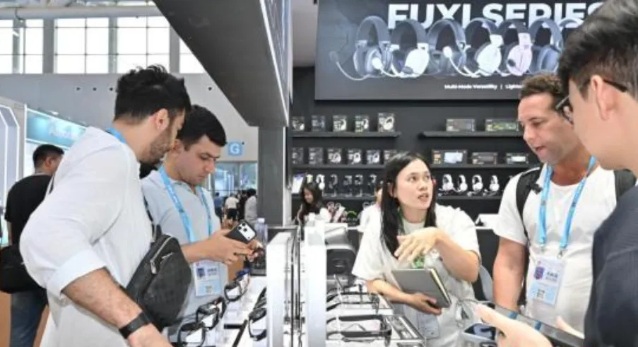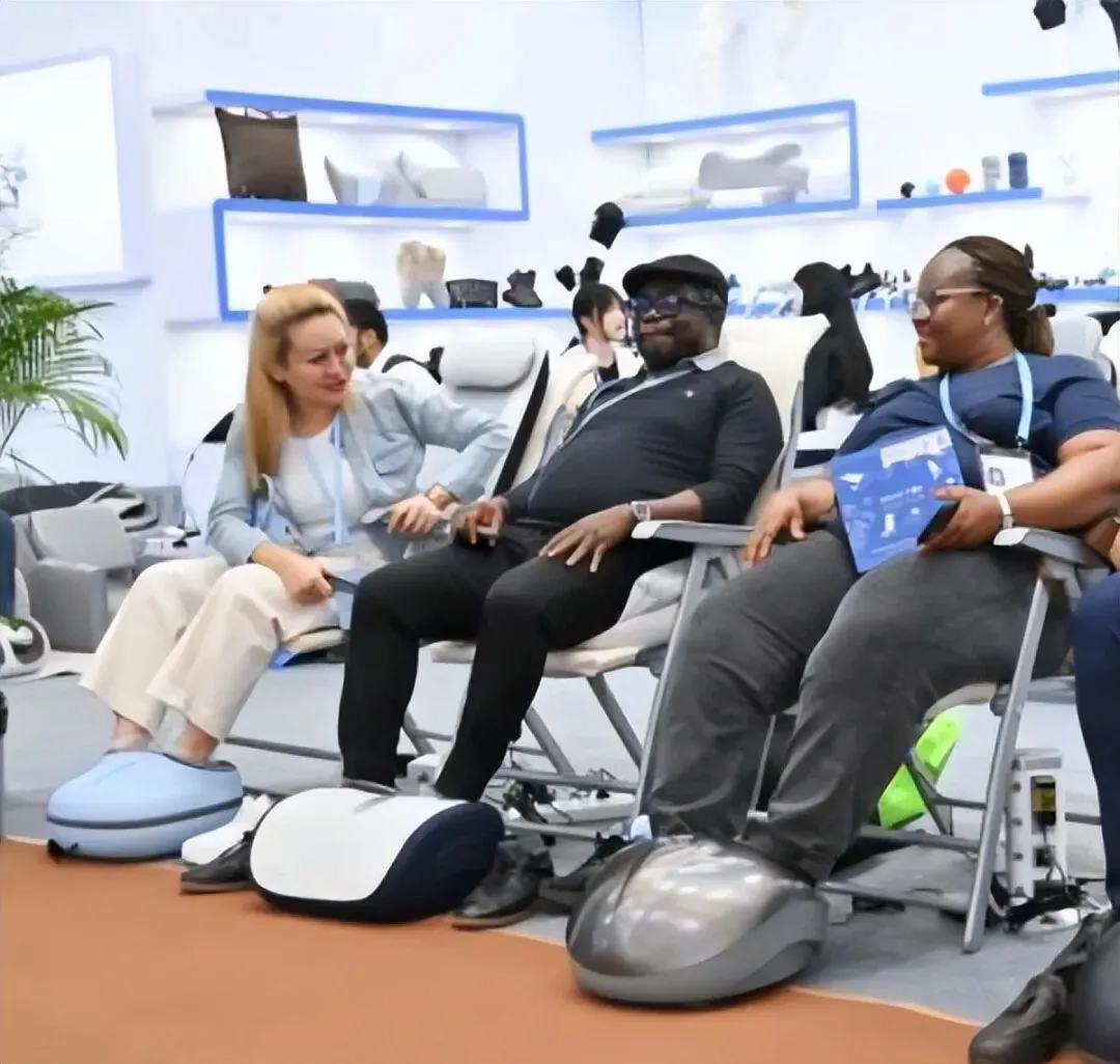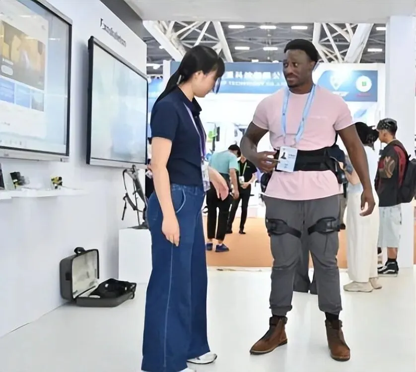 昨天从D区进去的,一进门就后悔没穿双软底鞋。智能穿戴专区今年第一次单列出来,好家伙,人贴着人走。我旁边一个中东大叔一直在跟他同事喊“excuse me”,根本挤不过去。外骨骼那几台机器前面排了得有二十来号人,有个欧洲的采购商试完以后当场就问CE认证过了没,供电时长多少,我看他手机里已经打开计算器在算数了。AI眼镜那边也是,几个人围着展商问能不能做定制镜片。