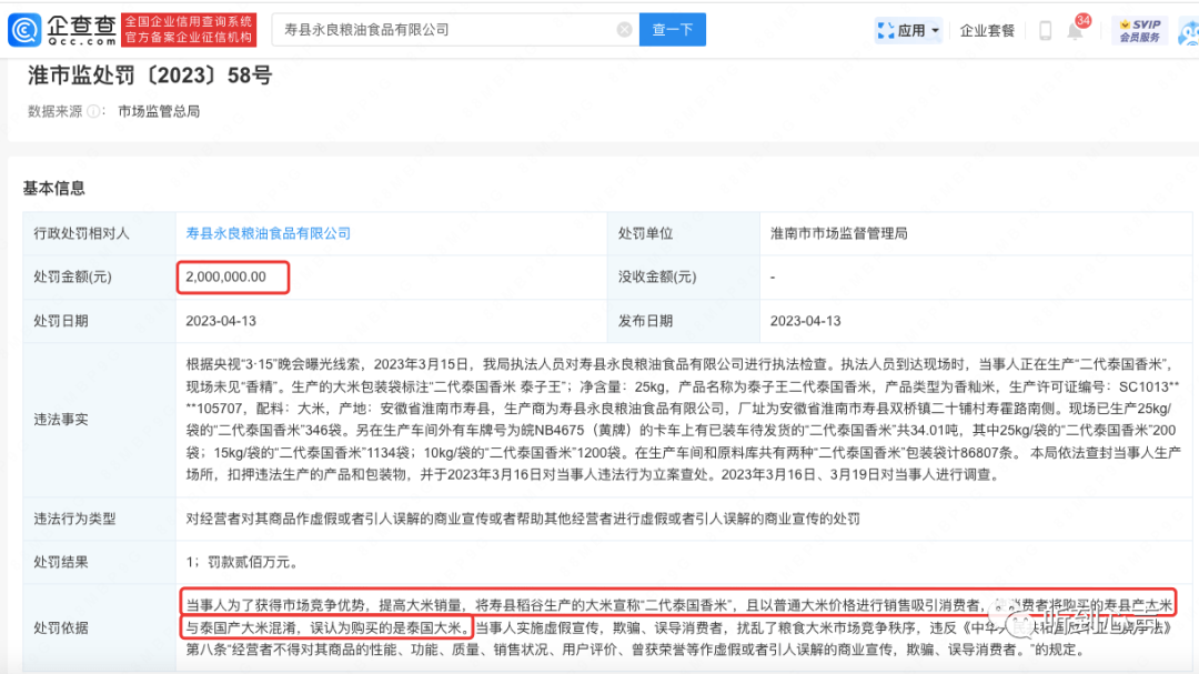 天眼查上的处罚事由显示,根据央视“3·15”晚会曝光线索,执法人员当日对该公司进行检查,发现当事人正在生产“二代泰国香米”,现场已生产25kg/袋的“二代泰国香米”346袋,另有已装车待发货的“二代泰国香米”共34.01吨,在生产车间和原料库共有“二代泰国香米”包装袋86807条。