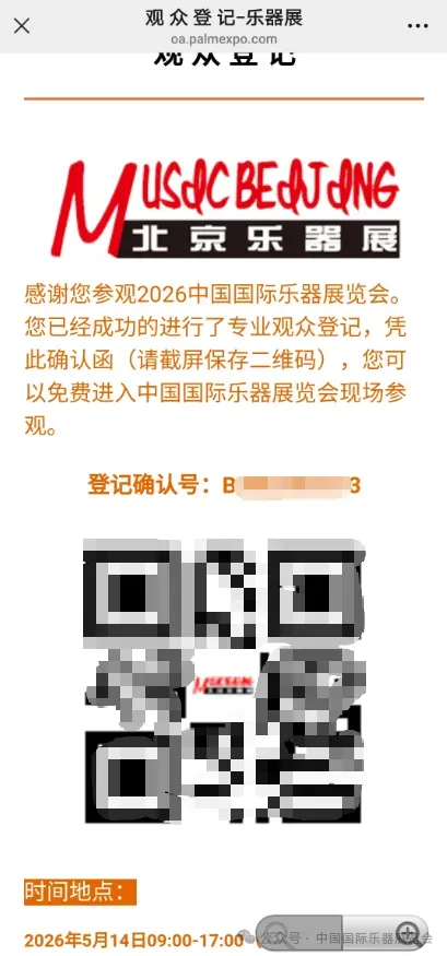 关注官方微信公众号(中国国际乐器展览会),进入公众号后,点击“我要参观”,按要求填写个人信息;提交后,请截屏保留二维码页面,凭二维码免费参观。