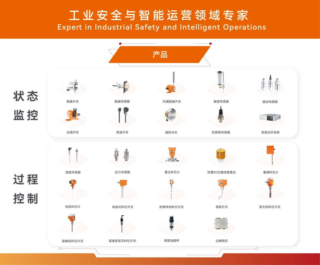 过程控制:温度传感器、压力传感器、雷达料位计、防爆3D扫描成像雷达、重锤料位计、电容料位计、电容料位开关、射频导纳料位计、阻旋开关、音叉型料位开关、振棒式料位开关、智能油脂杯等。