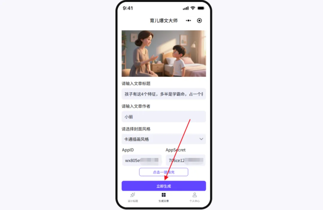 点击智能体底部【生成文章】填写文章标题、文章作者、画面风格、公众号的两个参数。