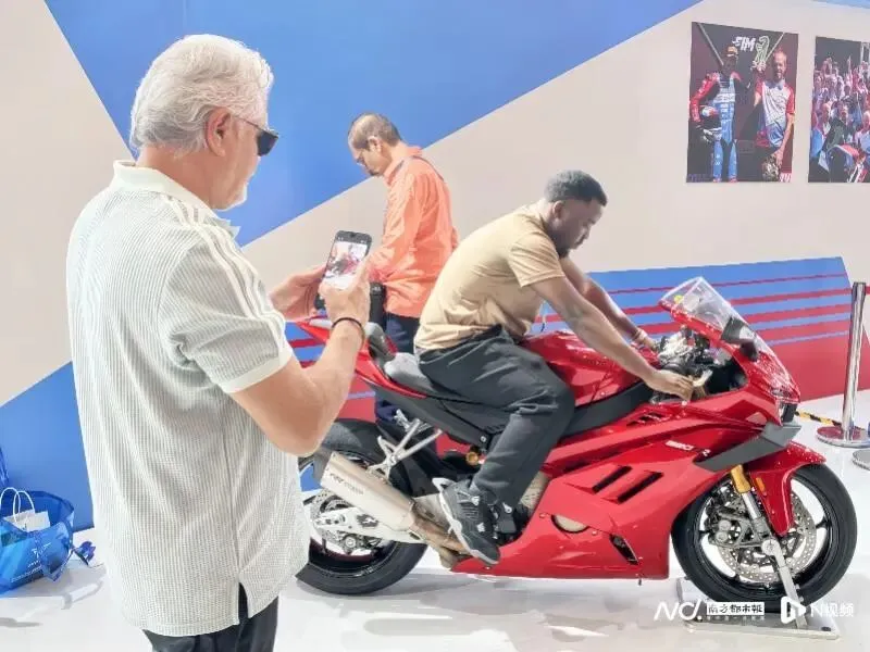 南都湾财社记者注意到,张雪机车展台现场,不少外国客商纷纷咨询工作人员:何时才能在本国买到。有采购商表示,此前是通过网络和视频内容了解到这个品牌,“它赢得了国际比赛。”