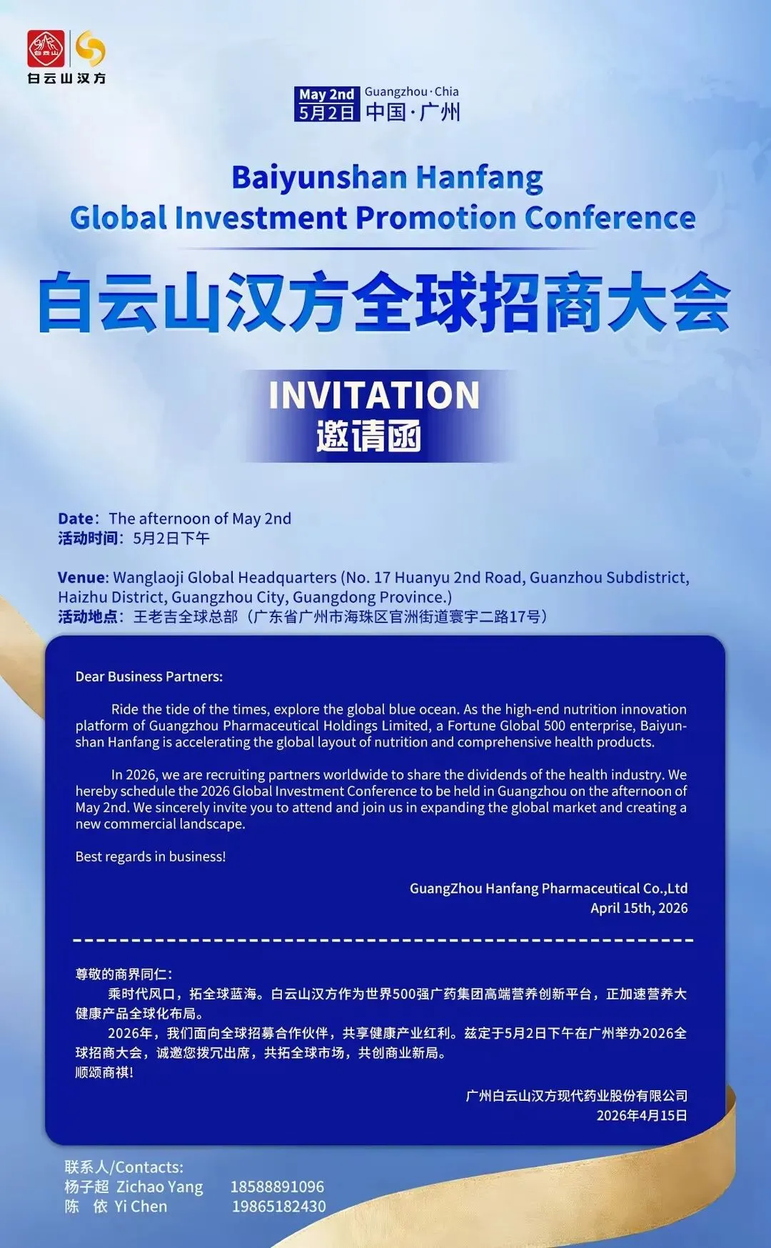 值此广交会盛大召开之际,白云山汉方作为世界500强广药集团高端营养创新平台,联合王老吉大健康共同举办全球招商大会。诚邀世界各地经销商、投资商、渠道精英、健康产业伙伴莅临参会,共拓万亿大健康国际市场!