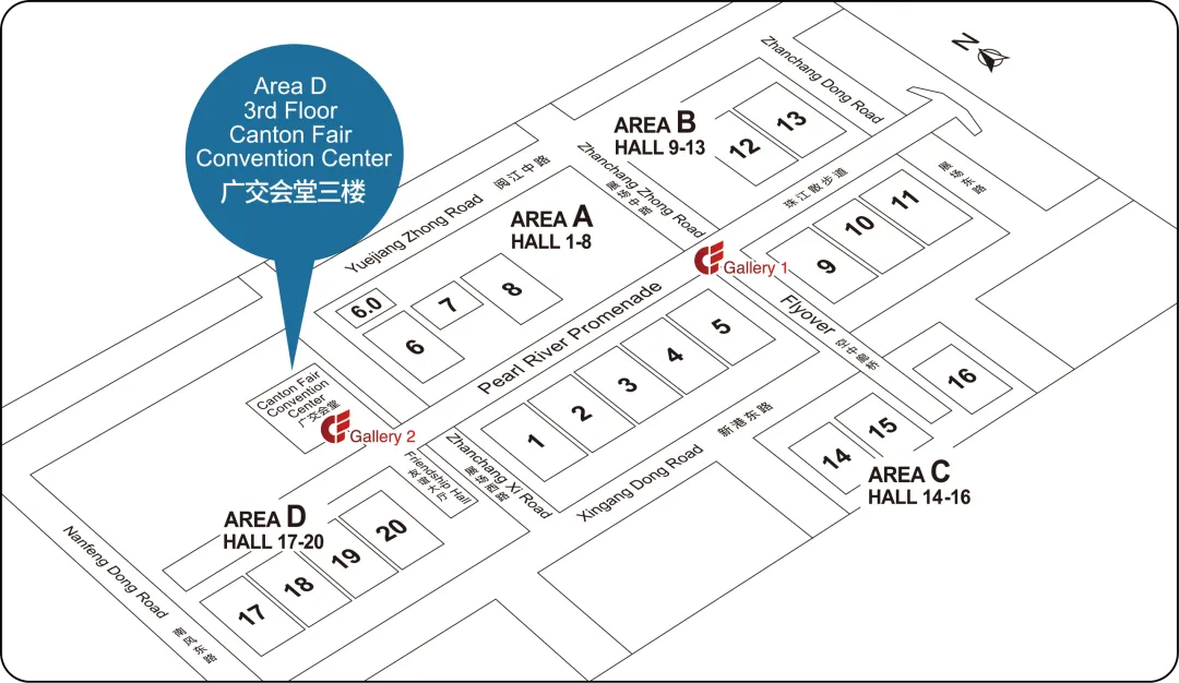 进入广交会展馆D区,从珠江散步道步行至广交会堂区域,依照指示乘坐扶梯前往三楼即可到达广交会堂三楼CF奖展示厅。