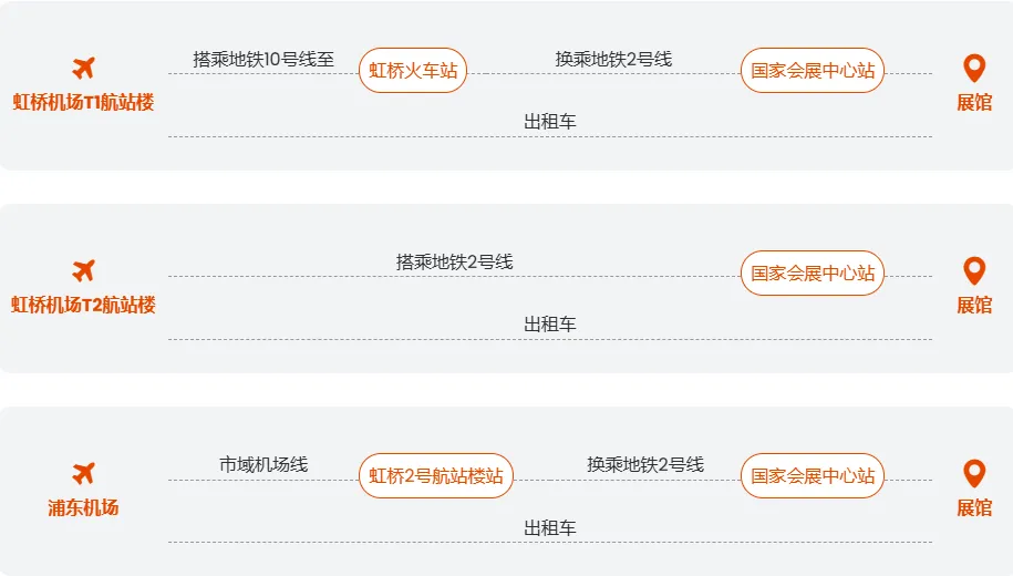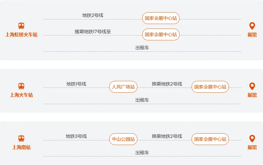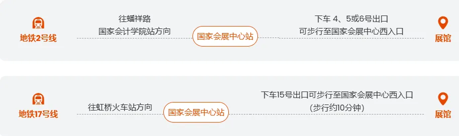 1. 乘坐10号线前来的到场人士,可在虹桥火车站换乘17号线,轻松避开拥挤的2号线。2. 乘坐市域机场线前来的到场人士,在虹桥2号航站楼站下车后换乘地铁2号线可前往国家会展中心。