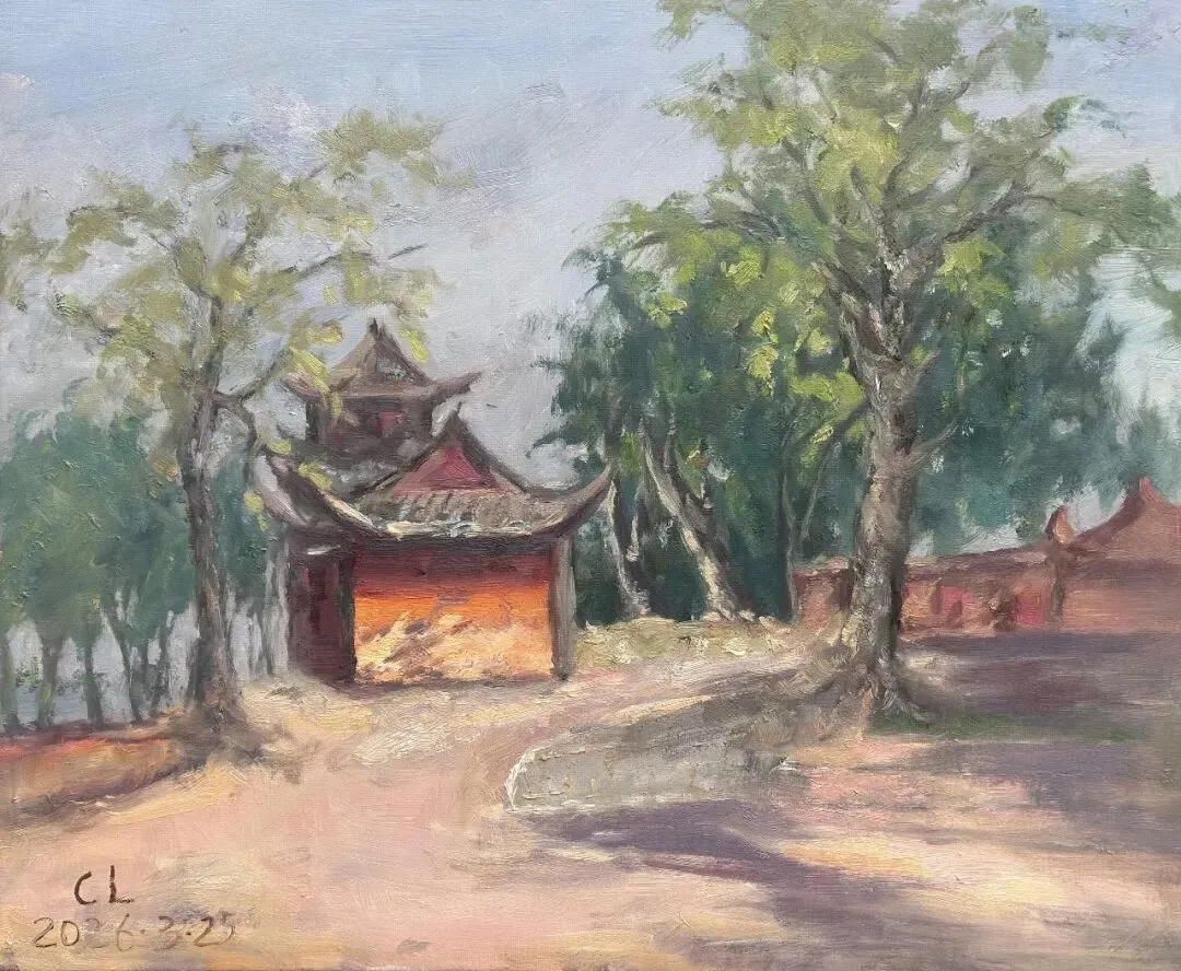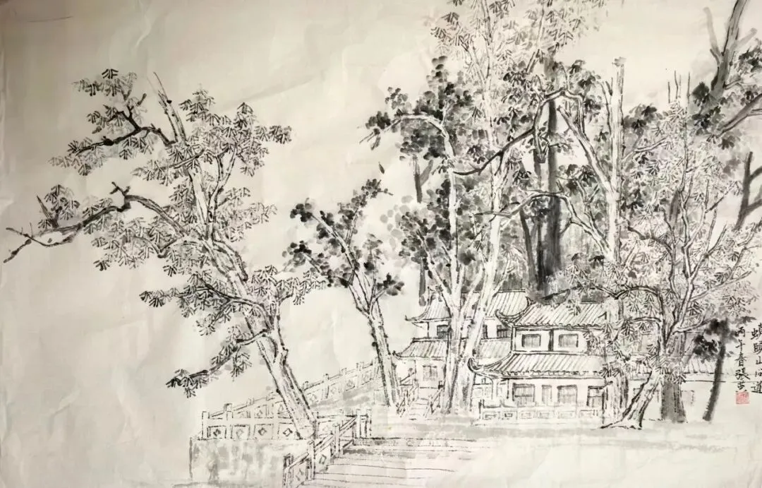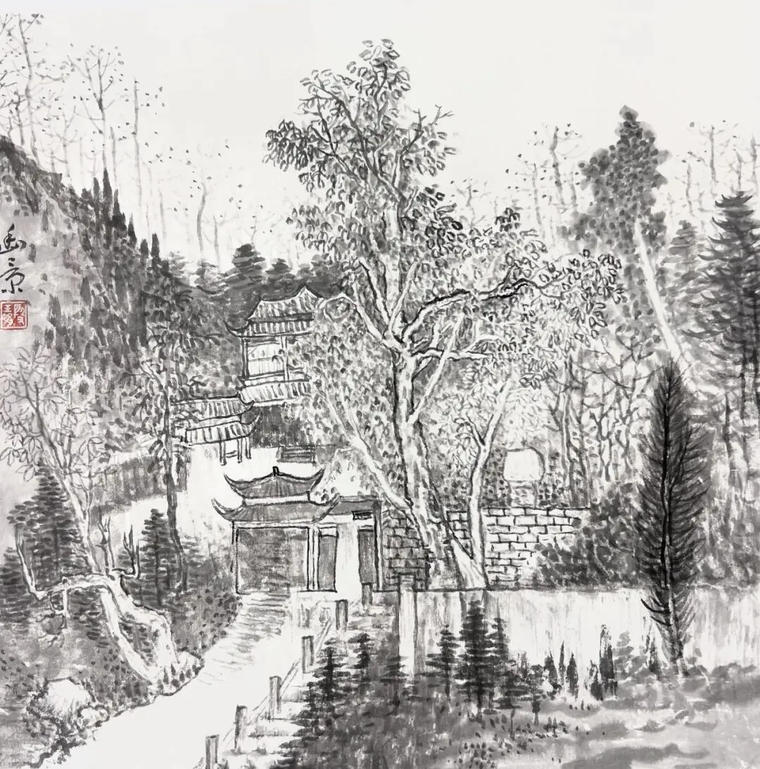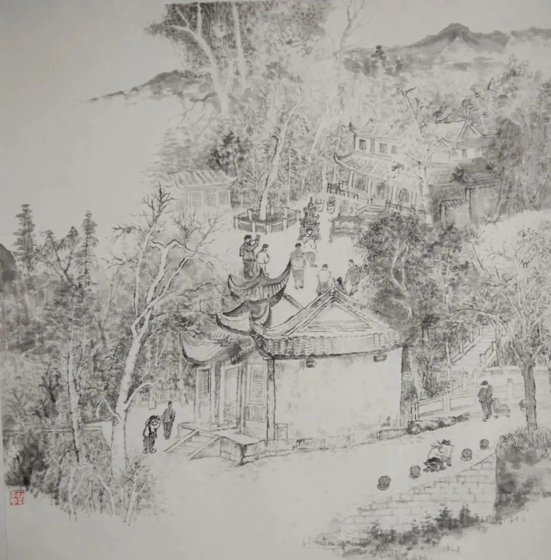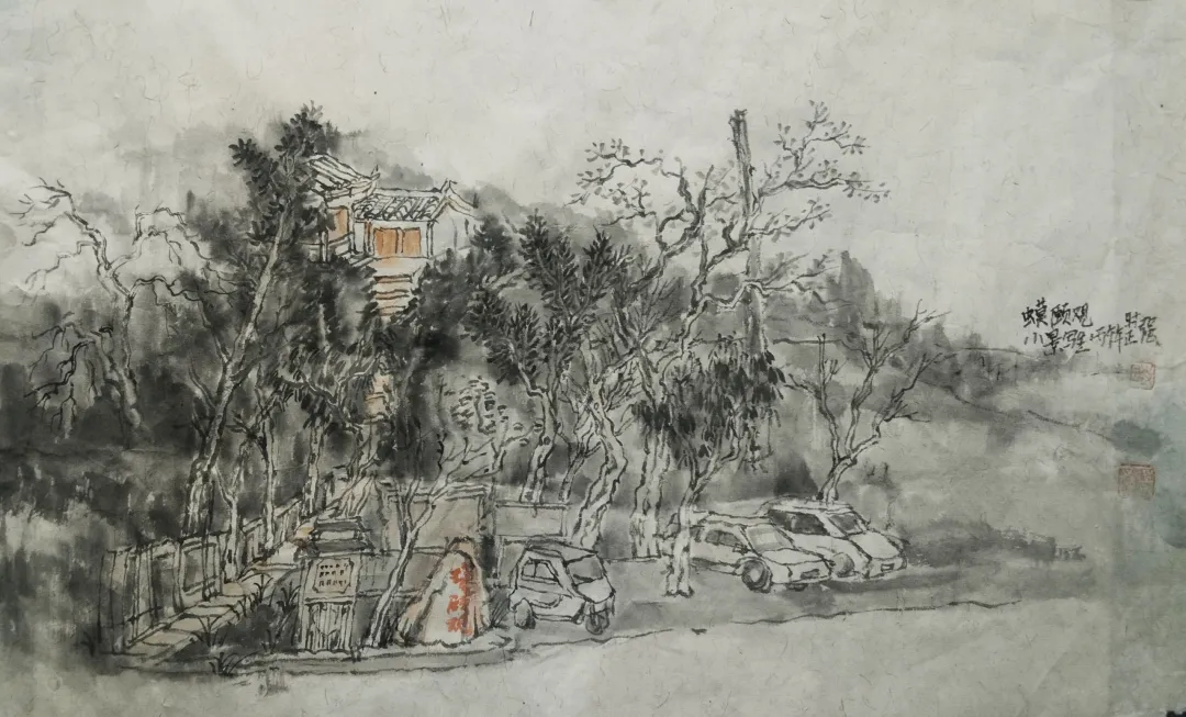 三月的蟆颐山,道观藏翠,山径蜿蜒,自然与人文交融的景致,为画家们赋予了无尽灵感。这33幅参展作品兼具扎实的写实功底与鲜明的个性表达,内容丰富而鲜活:既有蟆颐山道观点缀苍翠的全景勾勒,也有古建飞檐翘角的细节描摹;既有林间光影流转的细腻捕捉,也有远山层峦叠嶂的墨韵铺陈,还有山间一草一木的灵动刻画。每一笔都饱含真诚,每一幅都藏着匠心。